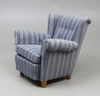 Soffa och fåtölj klädda i blå randig klädsel, lösa plymåer. Soffans längd 185 cm.
