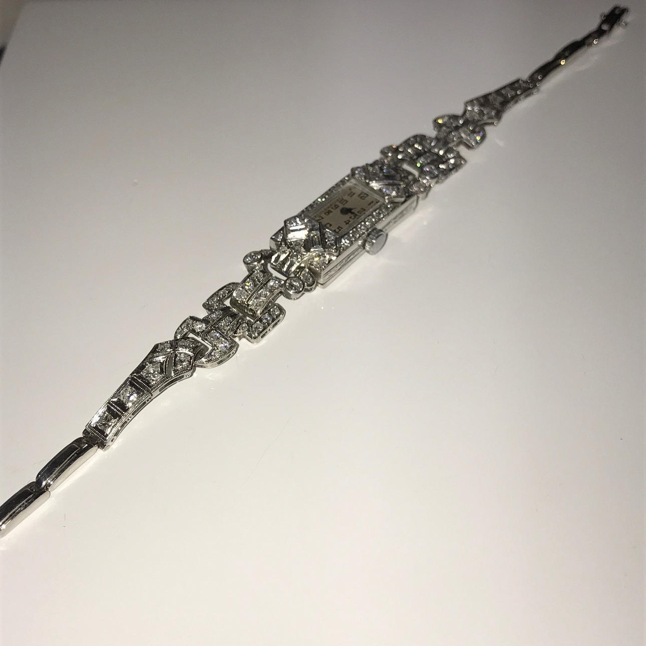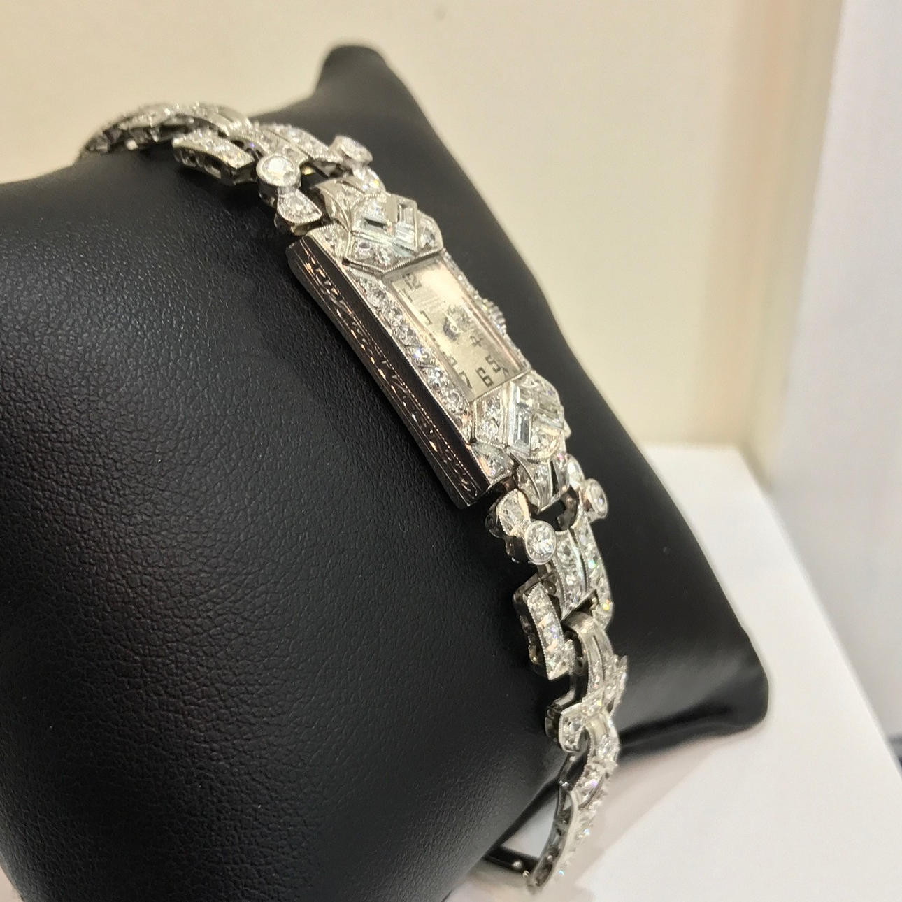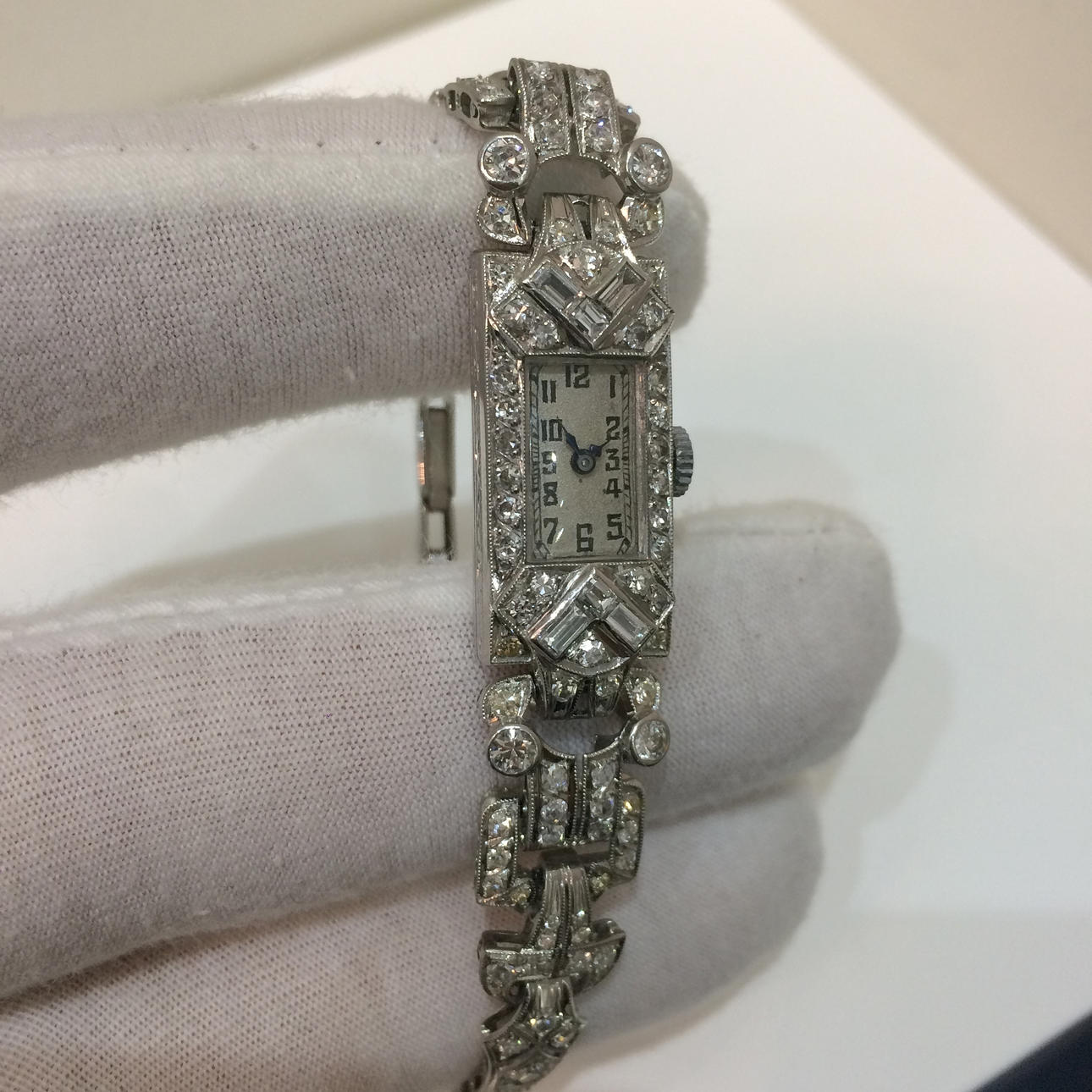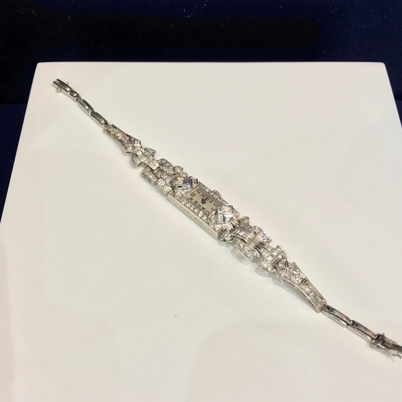 Klockan är art deco och är inställd med en blandning av runda åttkantslipade diamanter, fyra gammalslipade diamanter och sex baguetteslipade diamanter.