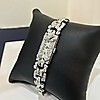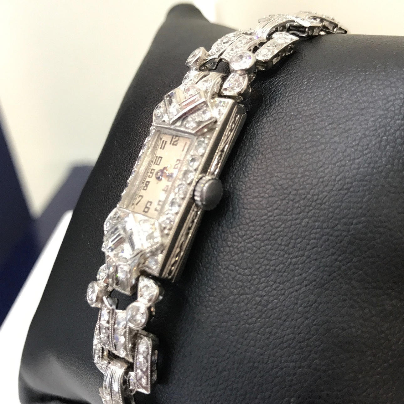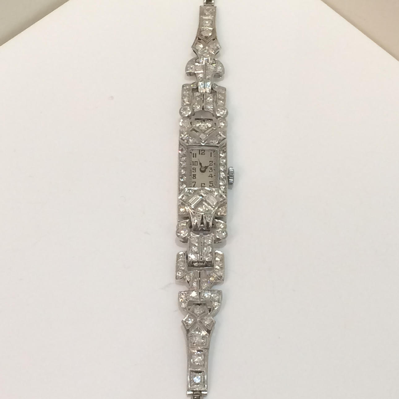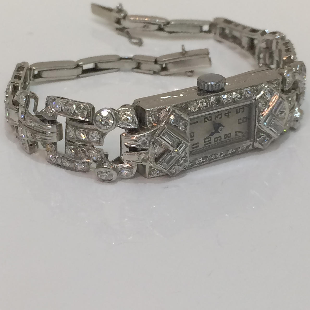 Klockan är art deco och är inställd med en blandning av runda åttkantslipade diamanter, fyra gammalslipade diamanter och sex baguetteslipade diamanter.
