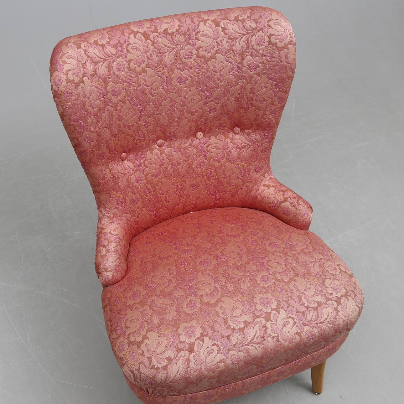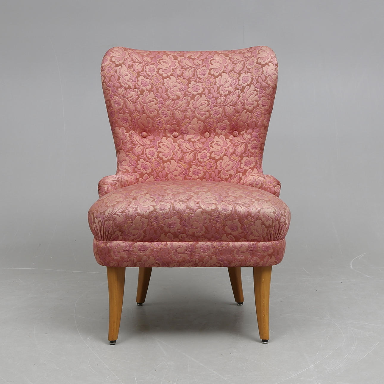 Rosa klädsel med blomstermönster. Ben av ljust lövträ.