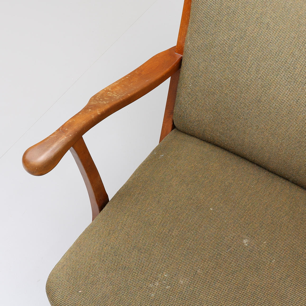 Något solblekt klädsel, fläckar. Ett armstöd med naturlig spricka.