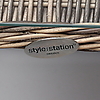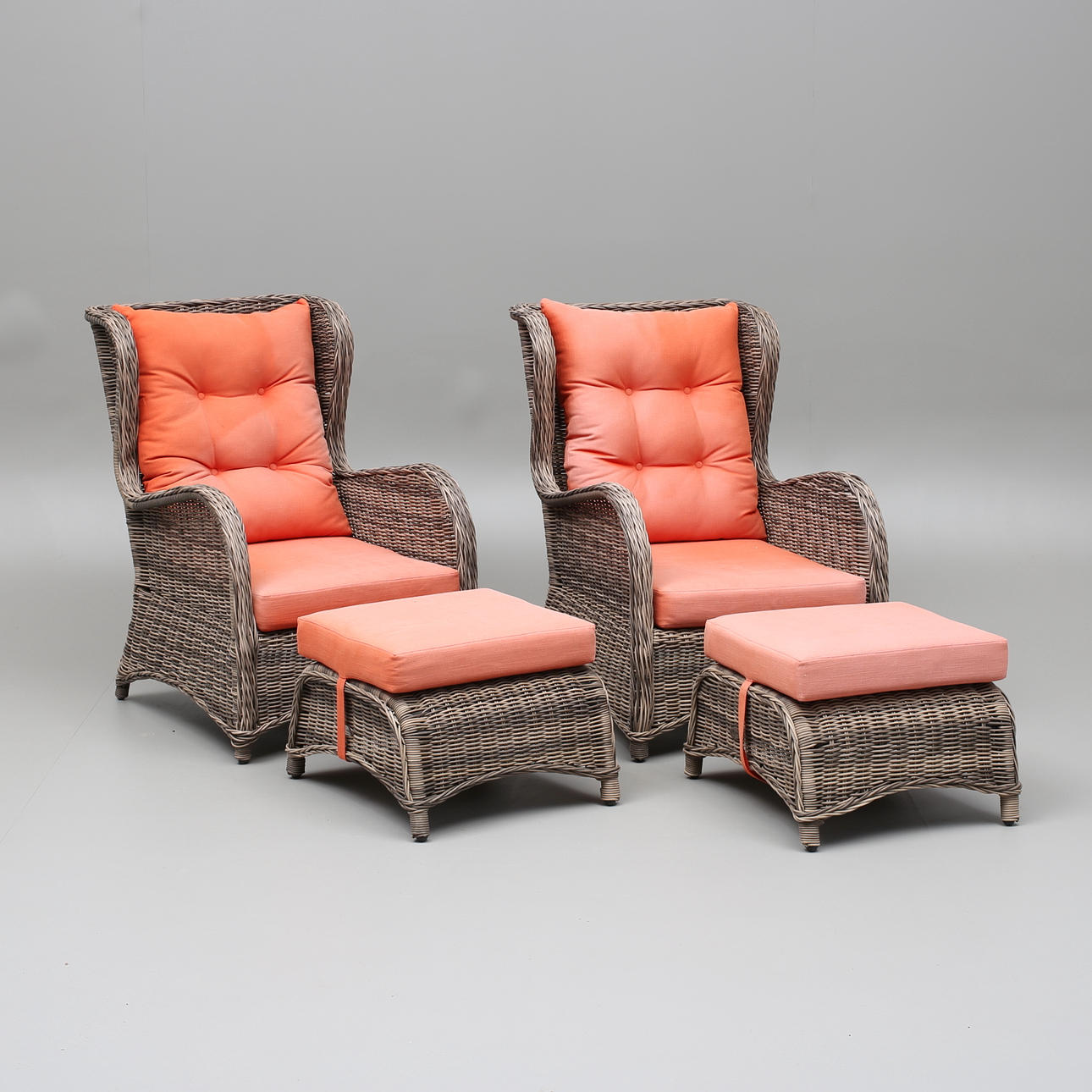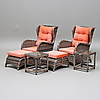 Ett par fåtöljer rygghöjd 100, bredd 66 cm. Ett par fotpallar höjd 40 cm. Ett par bord med glasskiva höjd 45 cm.