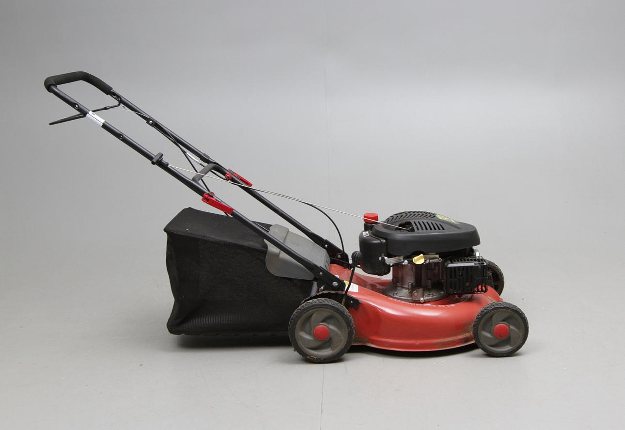 Med gräsuppsamlare.