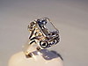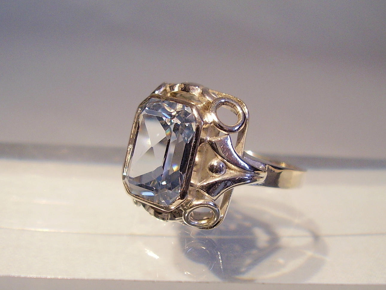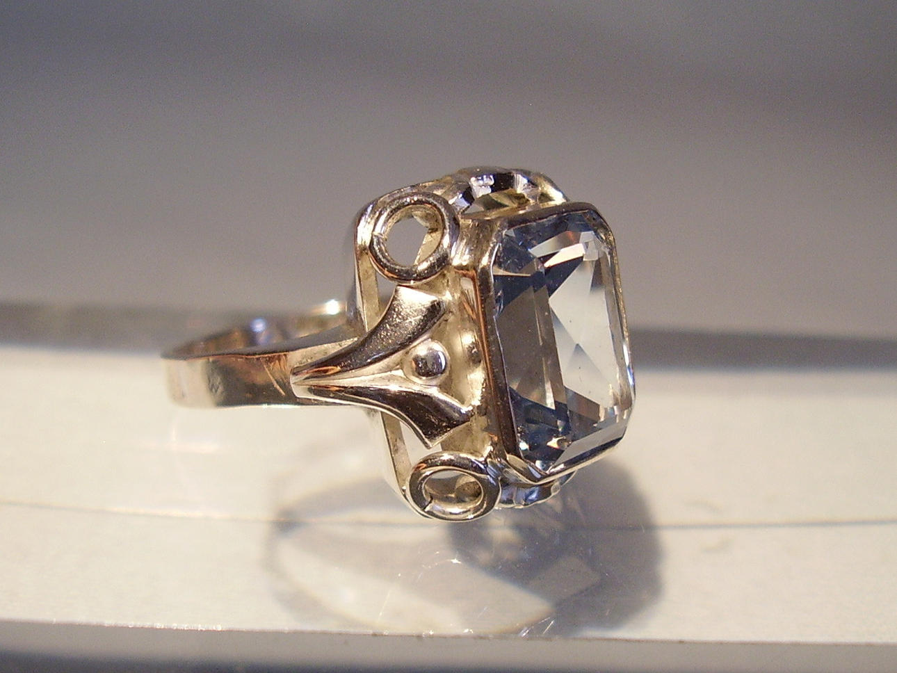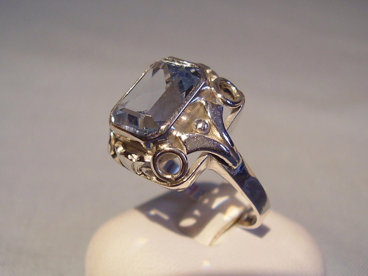 Den antika ringen är tillverkad i 800 silver och är stämplad som sådan. Ringhuvudet är inställt med en åttkantig fasetterad synth. blå topas på ca. 6 ct. i en slät ram och bred, genombrutna dekorativ miljö gjord av ornament och kullödning.