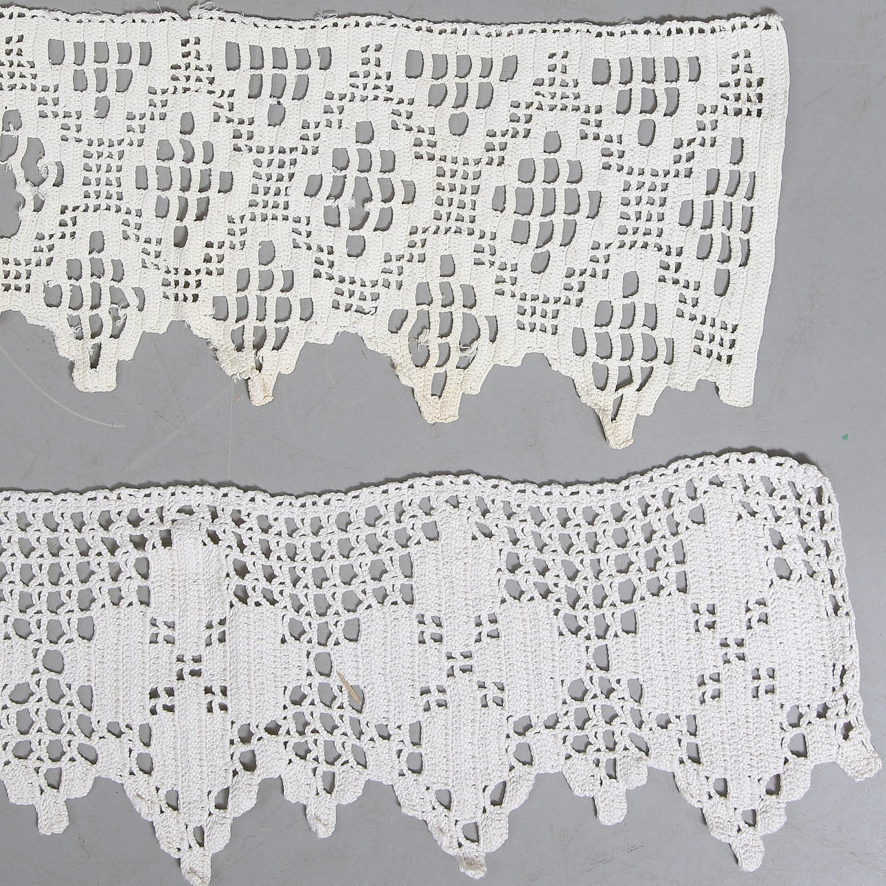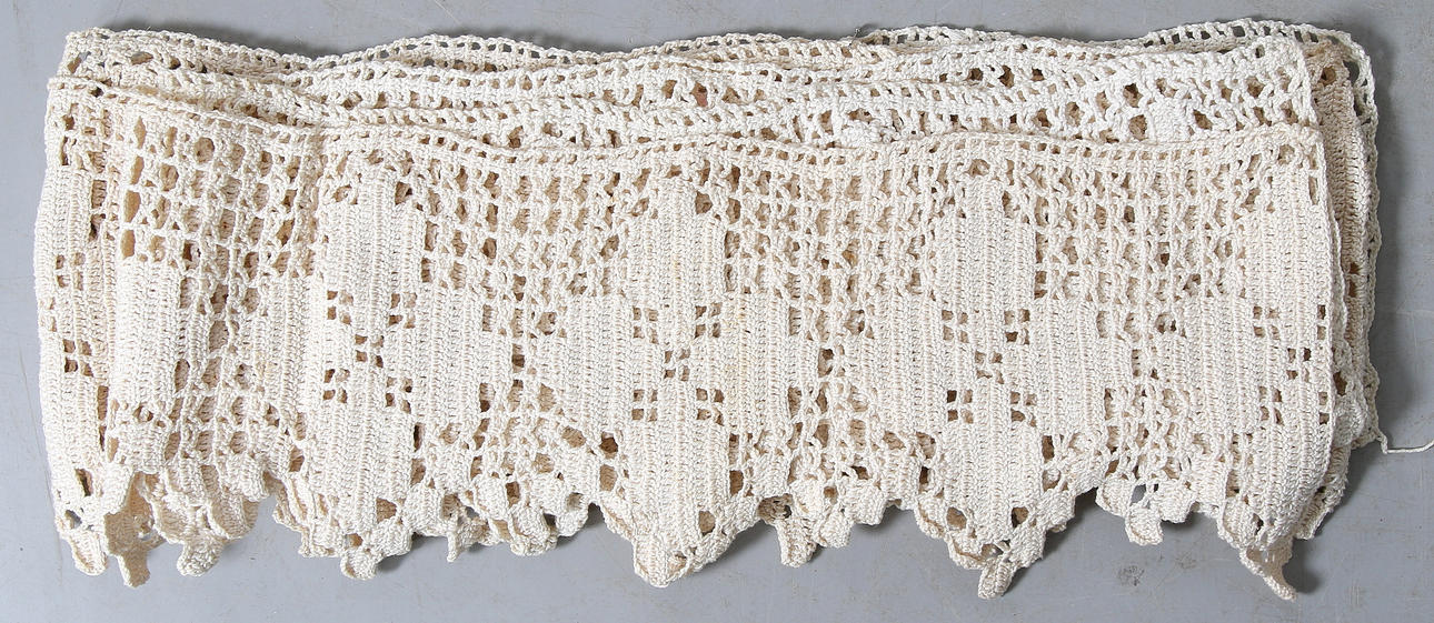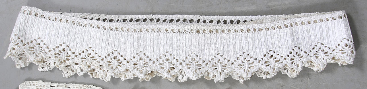 Vintervitt och oblekt bomullsgarn. Bredd ca 23 cm.
