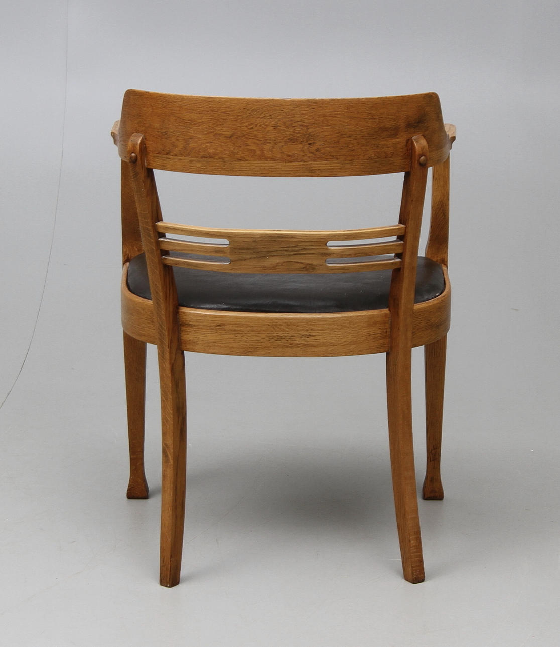 Ek, sitsen klädd med brunt läder.