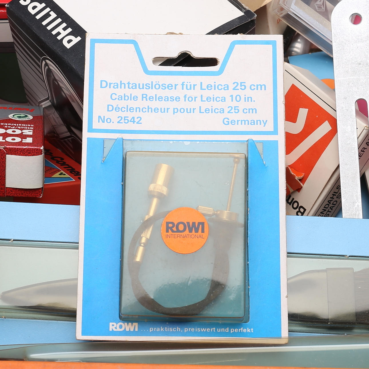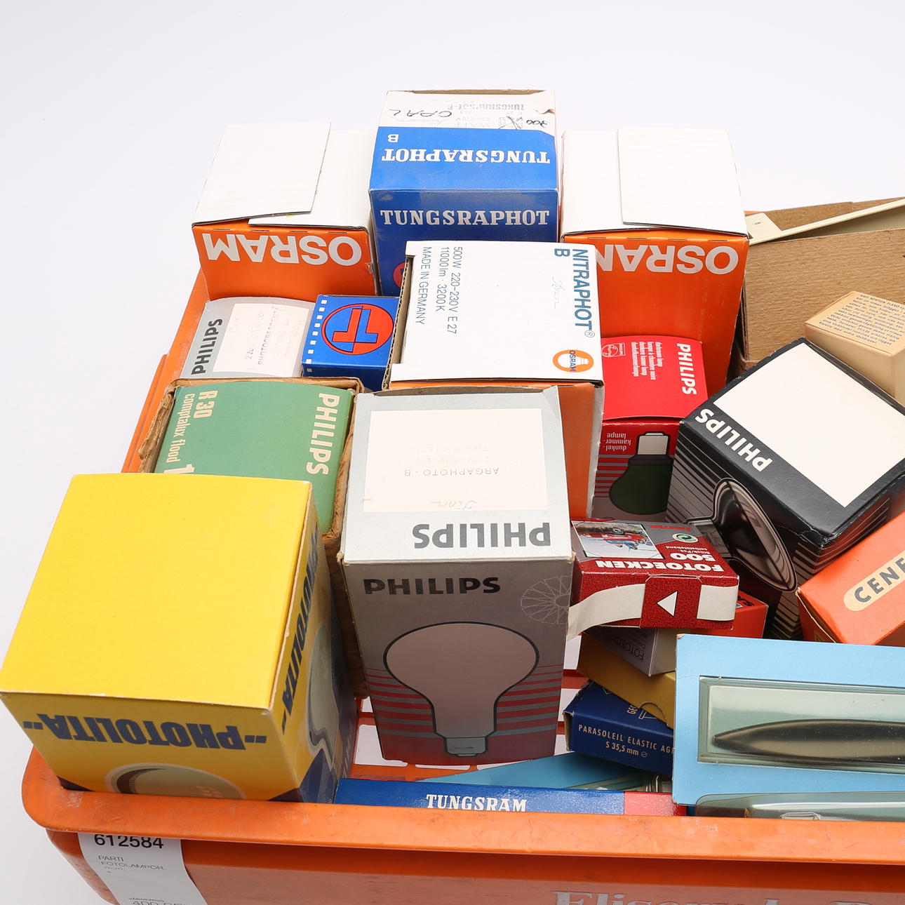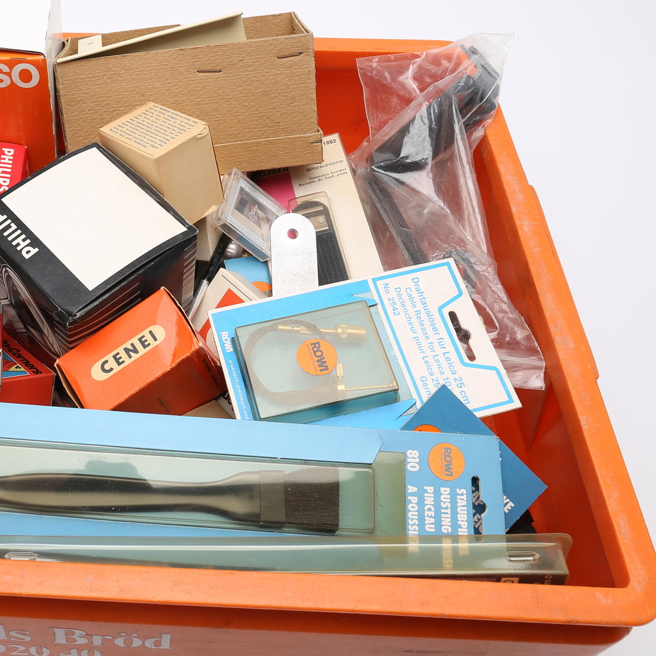 Lampor, olika modeller, bl.a, Osram, Philips. Fjärrutlösare till Leica, m.m.