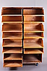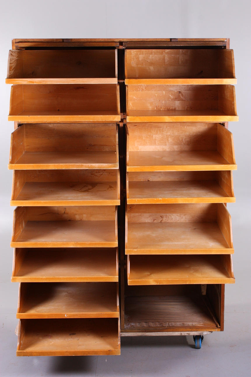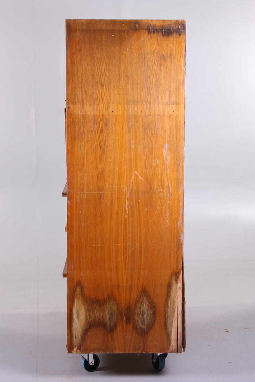 Slitage, fuktskador, faner skadad, lådor saknas, bakstycke lös, rostanlupet.