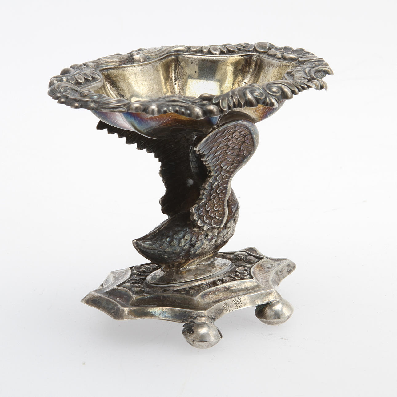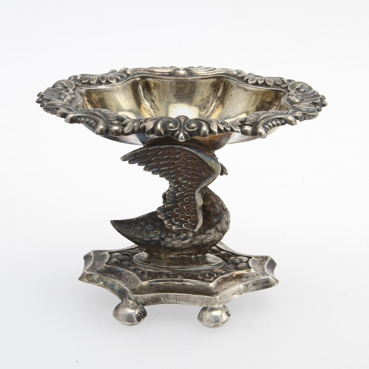 Skål uppburen av svan. Höjd 7, längd 10 cm.