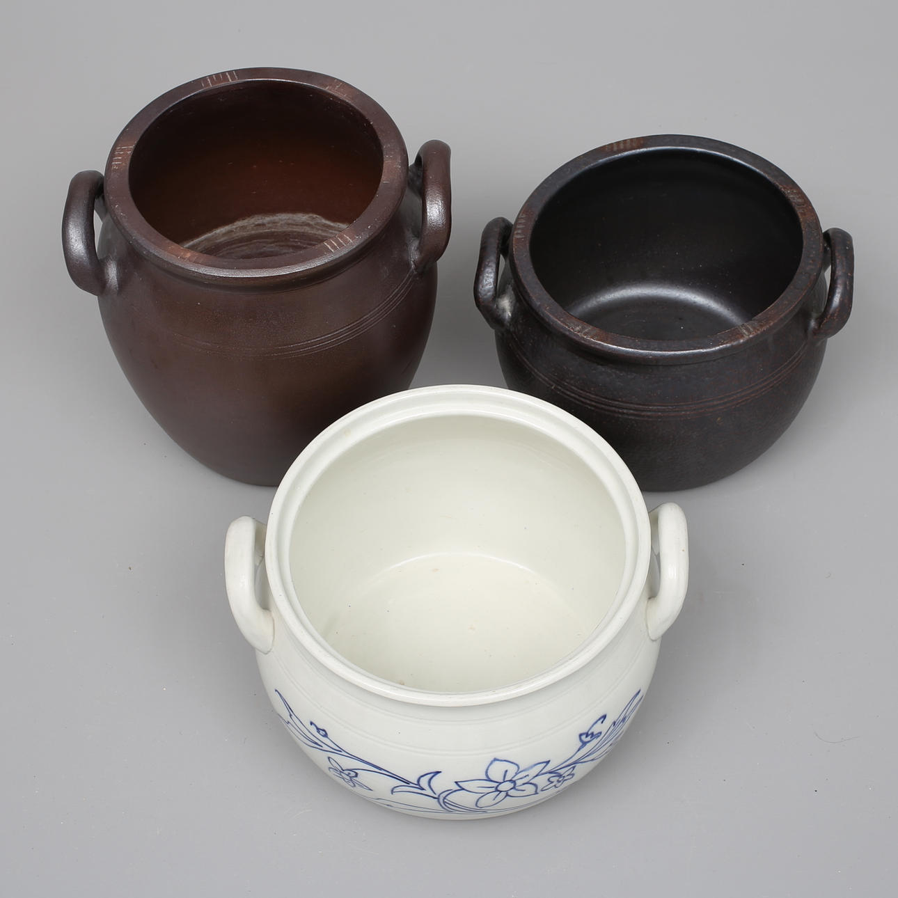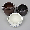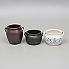 Blåvitt krus, Göteborg, höjd 19. Höganäskrus, 2 st, 6 samt 8 liter, höjd 18 respektive 26 cm.