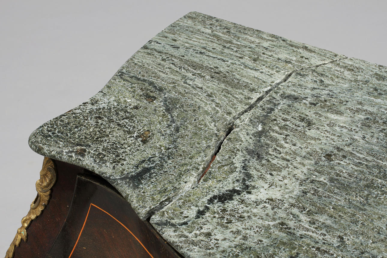 Omfattande skada på stenskivan. Spricka rakt igenom samt en bit saknas. Fanerskada samt bruksslitage.