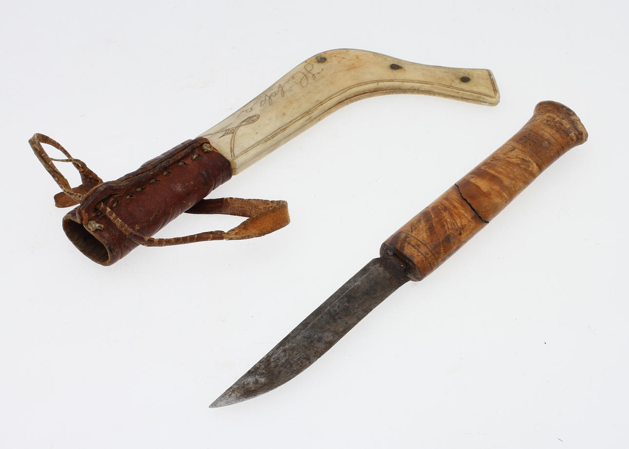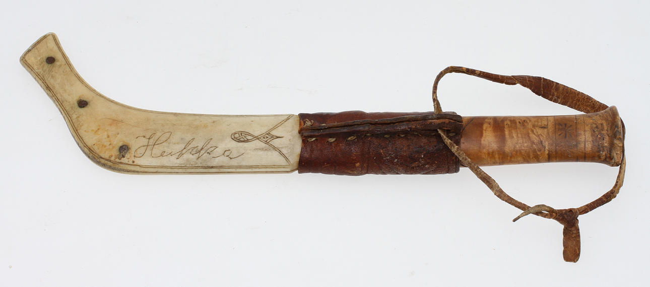 Masurbjörk, graverat renhorn och läder. Längd 20 cm.