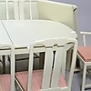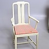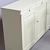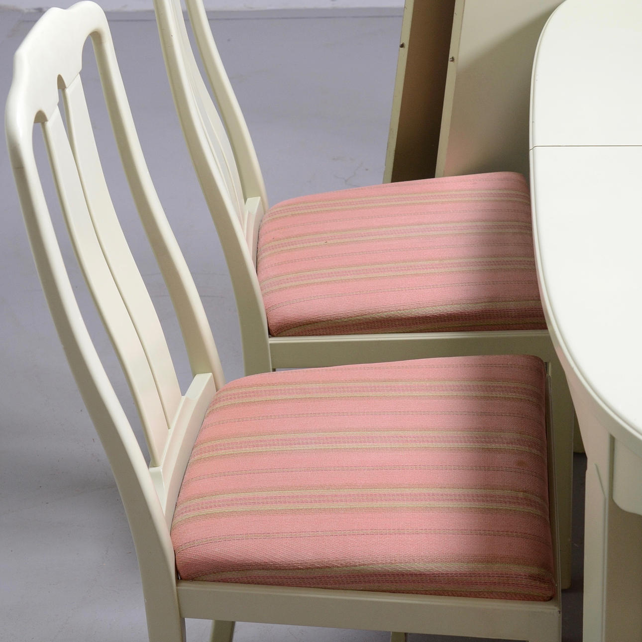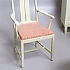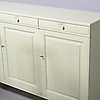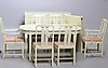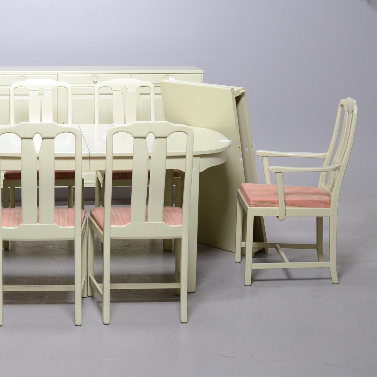 Carl Malmsten (1888-1972) Matsalsgrupp bord samt 6 stolar. Sideboard, tre dörrar samt tre lådor. Höjd 97 cm Längd 150 cm Modell "Ambassadör", formgiven 1968. 6 stolar med genombruten ryggbricka, lös sits med klädsel i ull. Matbord med 2 st iläggsskivor med sarg. Mått: bordet utan skivor, längd 155 cm, bredd 110 cm. Iläggskivorna 2x58 cm. Totallängd 260 cm. Framstår med smärre resning i bordsskivan samt ben med skavmärken.