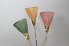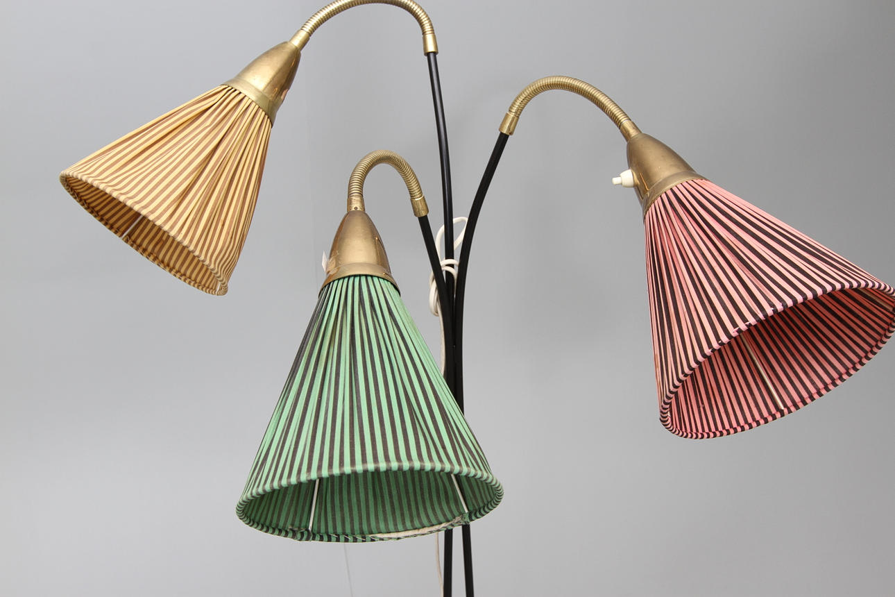 Svartlackerad stålstomme med mässingsdetaljer, tre ljuspunkter med röd/gul/gröna skärmar. Högsta höjd 181 cm.