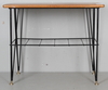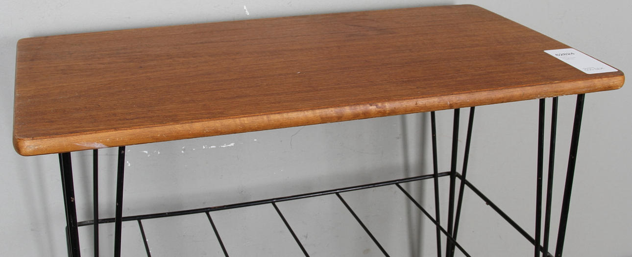 Skiva av teak, underrede av plastöverdragen metall. Längd 63, bredd 35, höjd 52 cm.