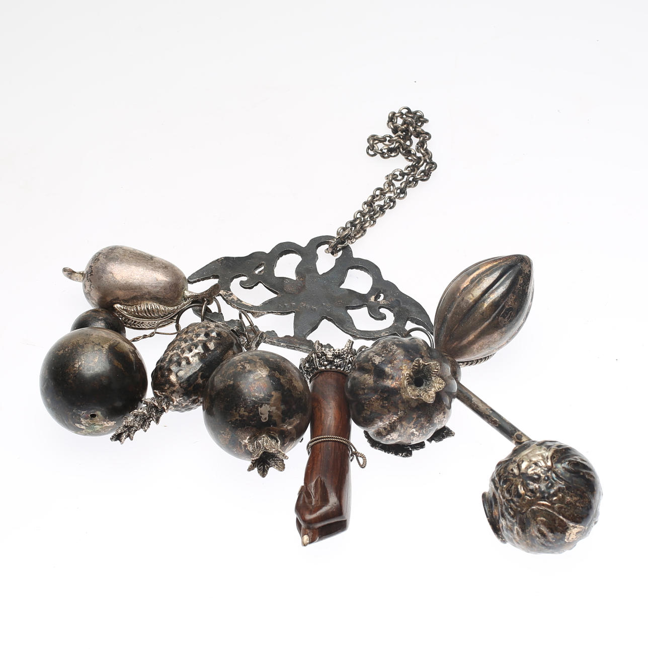 Dekor av bl a frukter och fåglar. Tötal höjd inklusive kedja ca 34 cm.