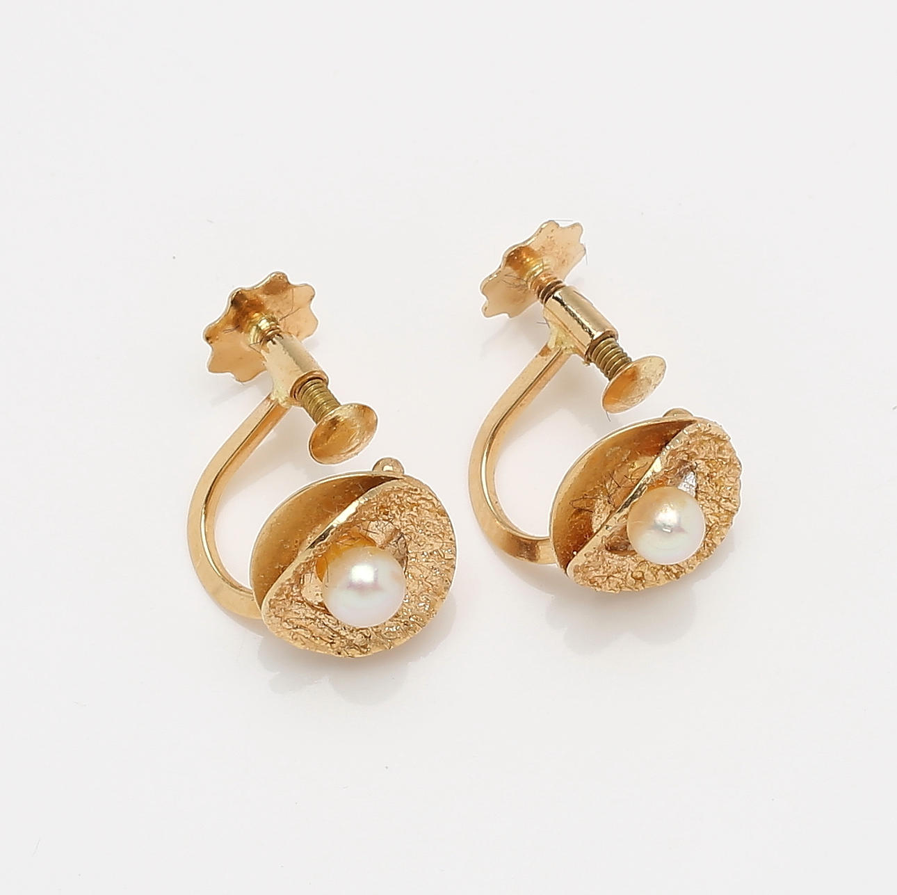 Ett par, med pärlor. Skruvmodell. Bredd ca 9 mm. Totalvikt ca 2,3 g.