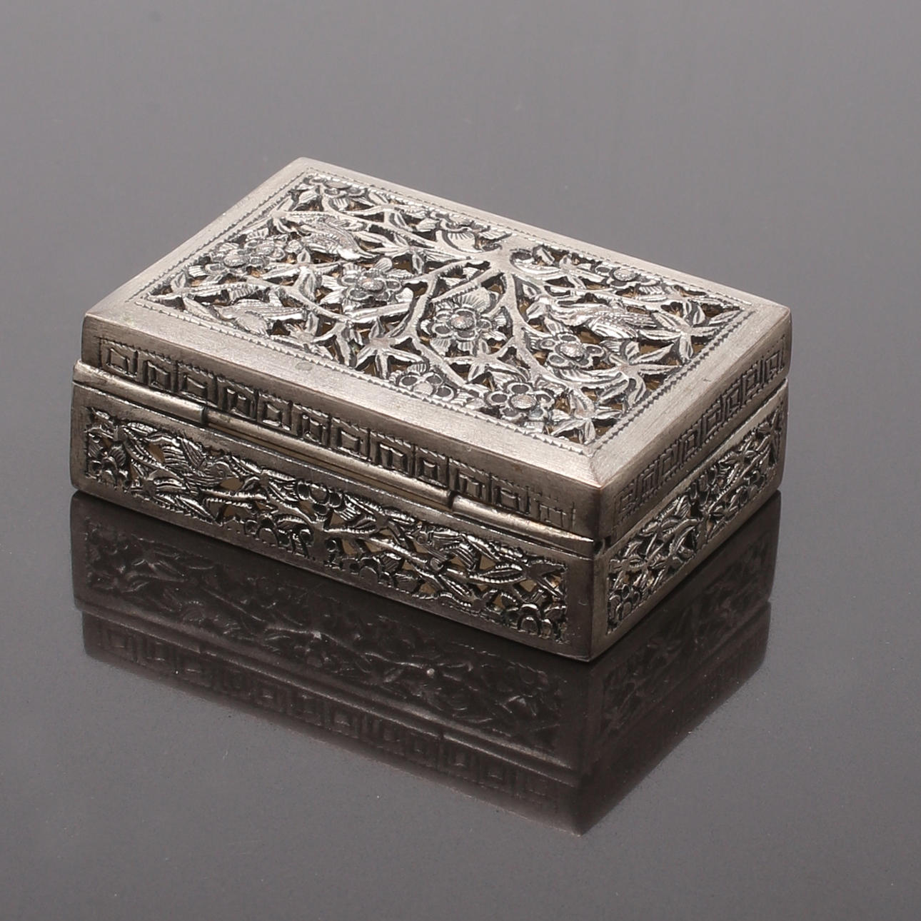 Ask i silver, utländska stämplar, höjd 2 cm, längd 6 cm, bredd 4 cm, vikt 46,53 gram.