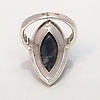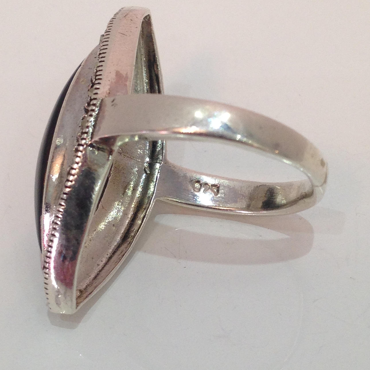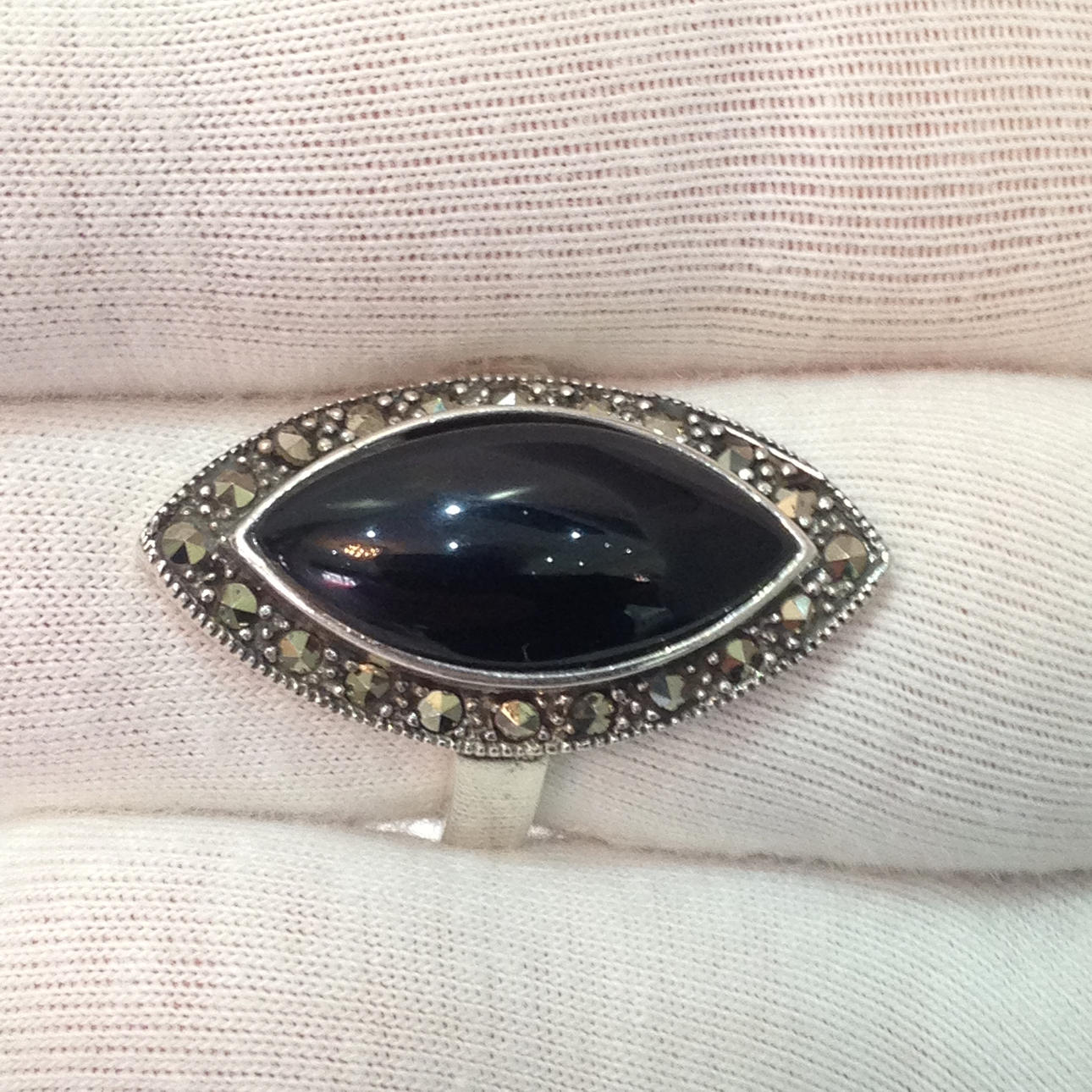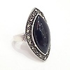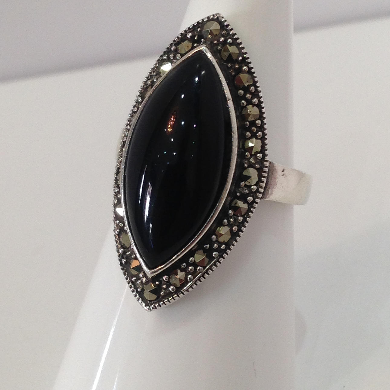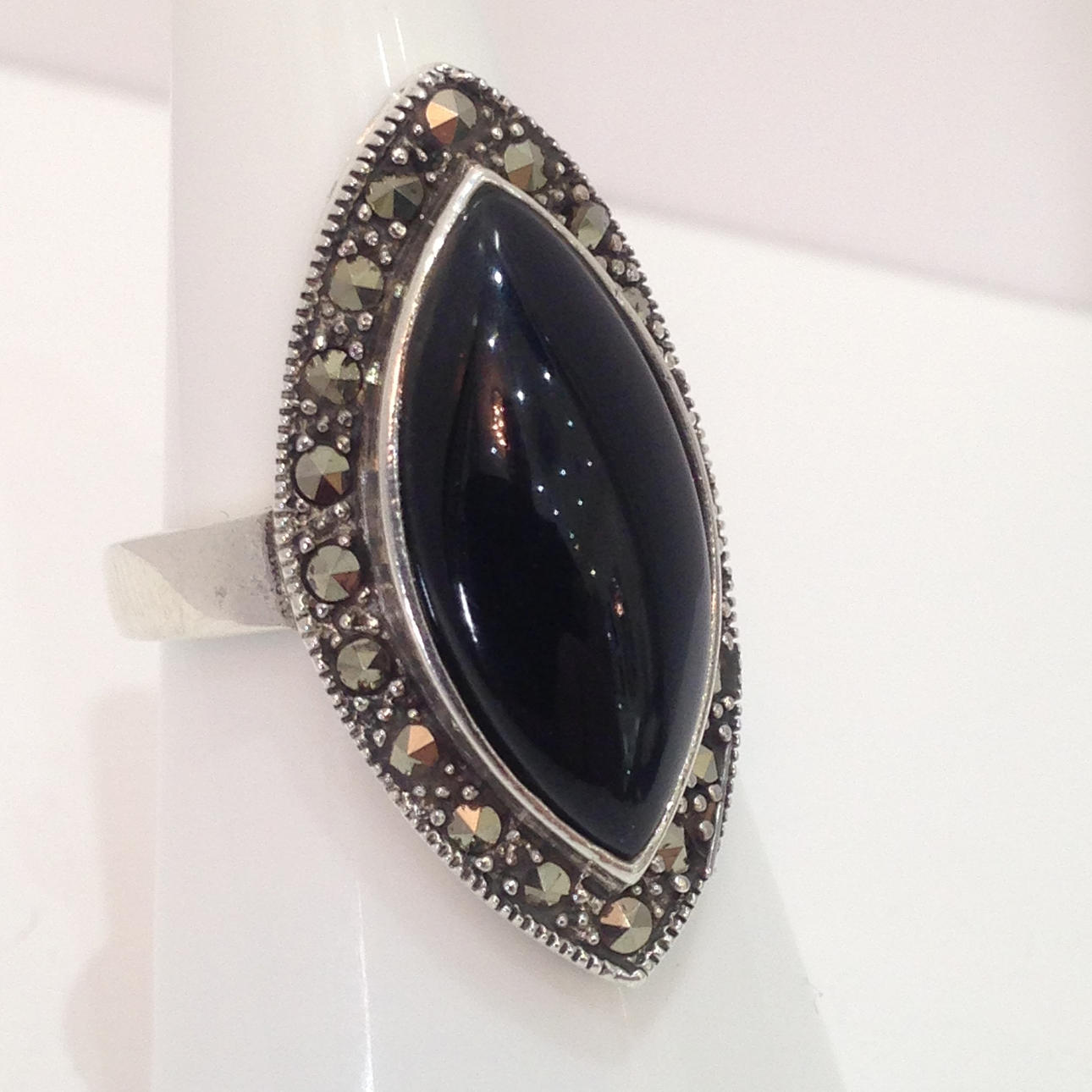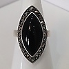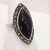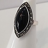 Denna ring är stämplad 925 (silver). Den är inställd med en stor markisskuren svart onyxsten. Onyxstenen är omgiven av markasit stenar.