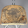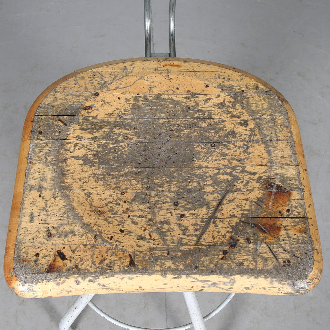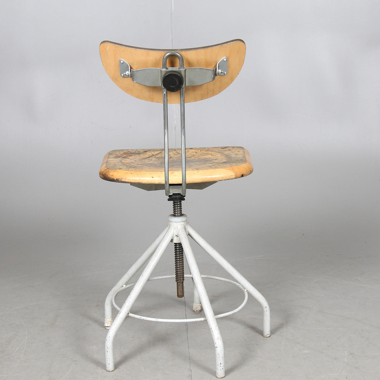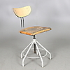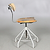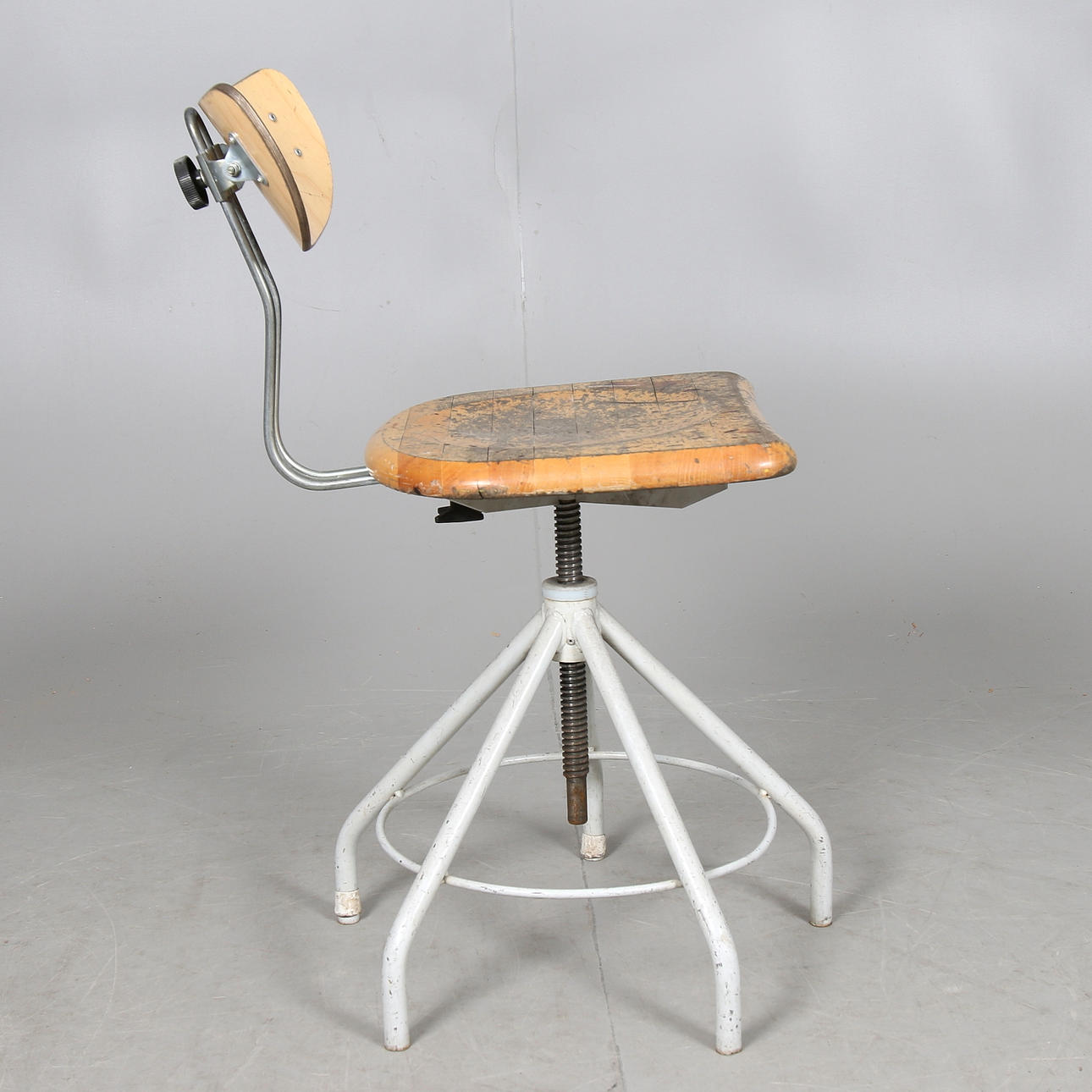 Stomme i metall med ryggbricka. Sits i massivt trä. Höjd och sänkbar. Ryggstöd reglerbart.