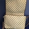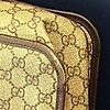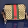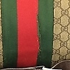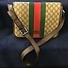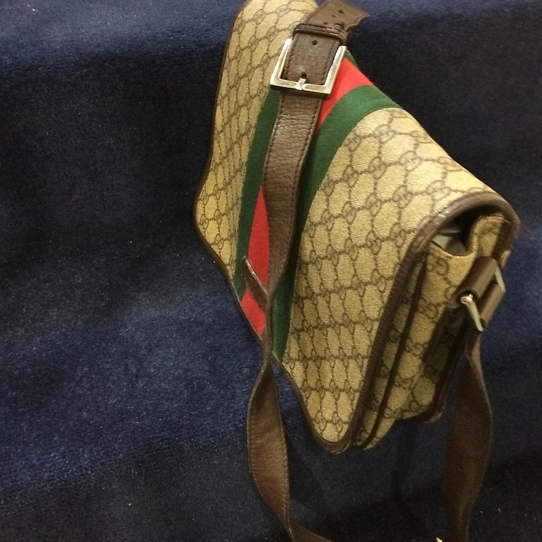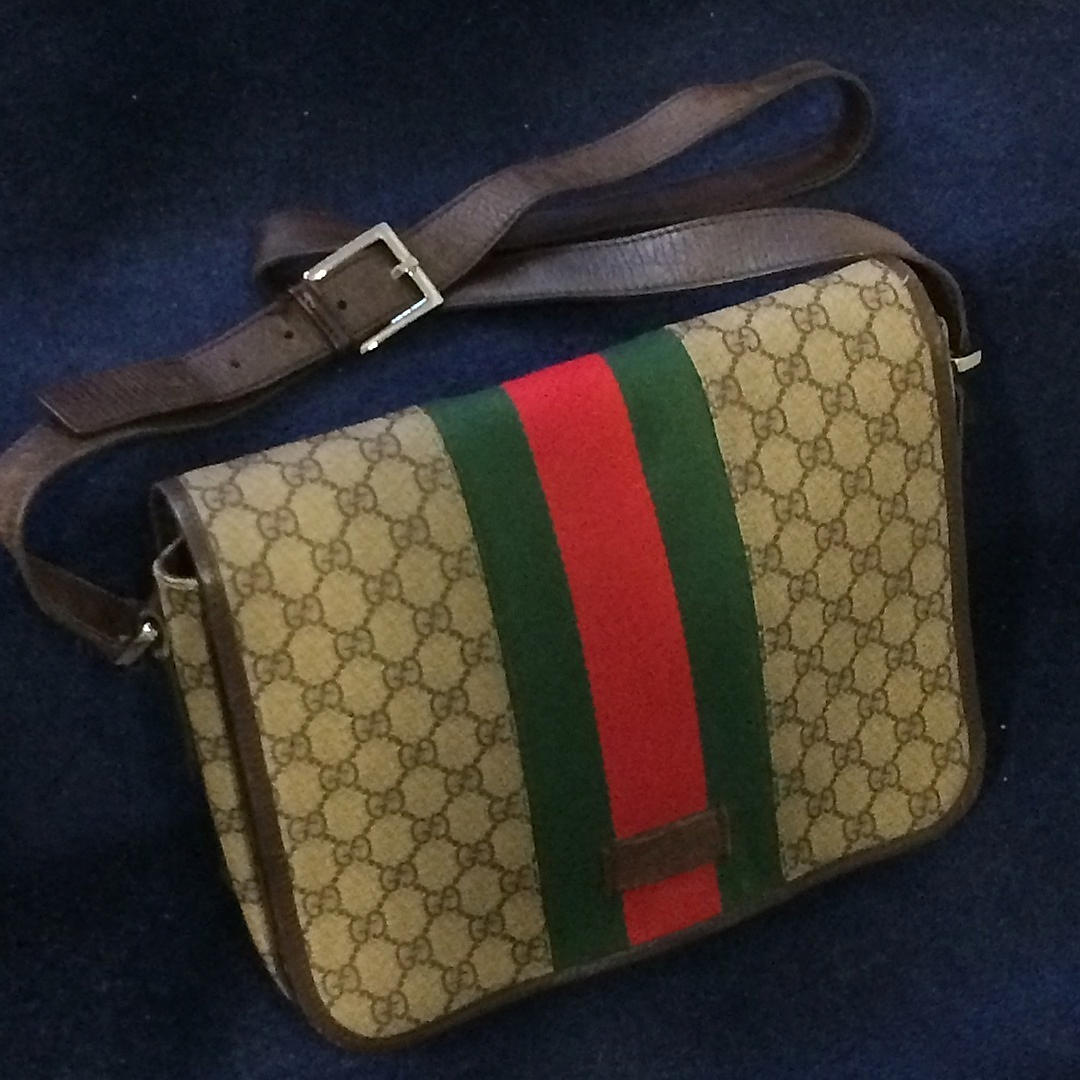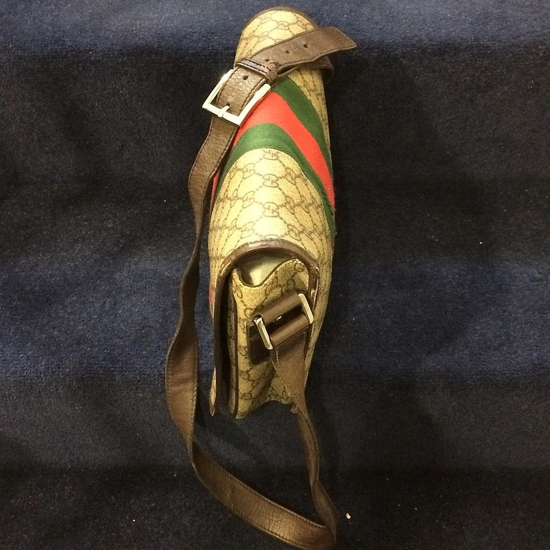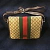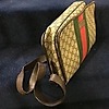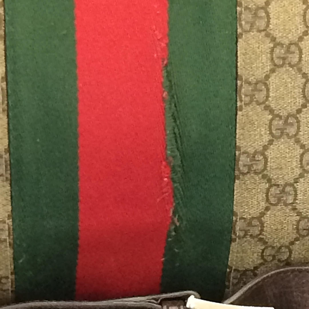 Denna Gucci-väska är gjord av en tjock PVC med den omisskännliga gröna och röda tygremsan.