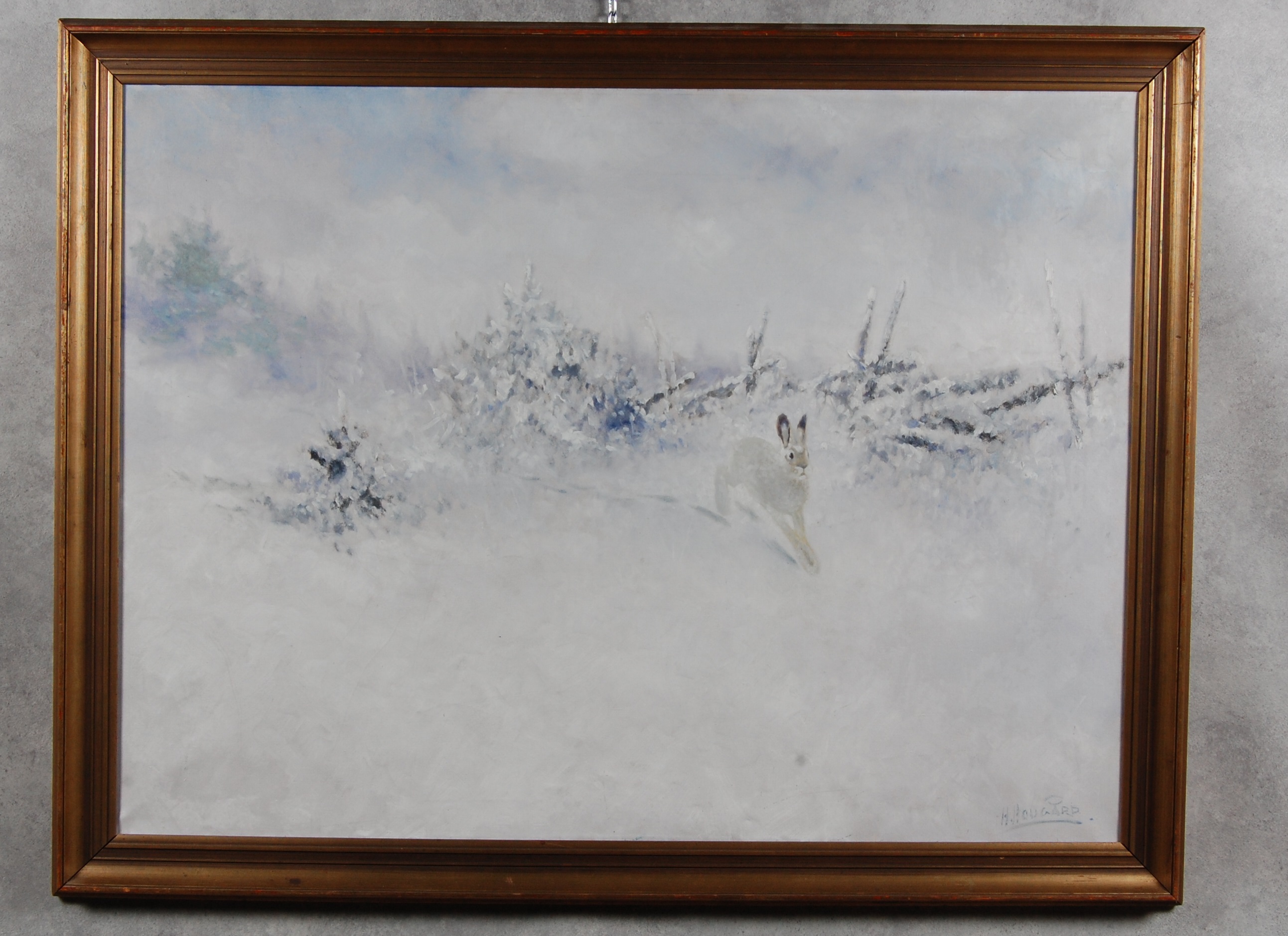 65666. H HOUGÅRD. olja på duk, " Hare i vinterlandskap ".