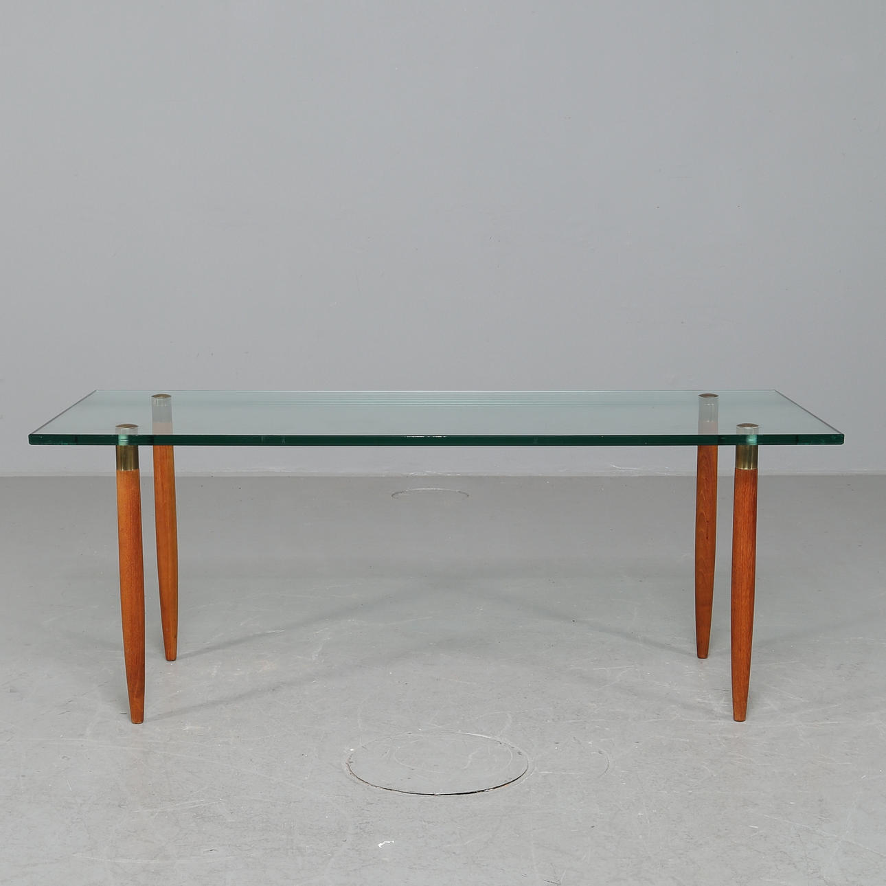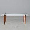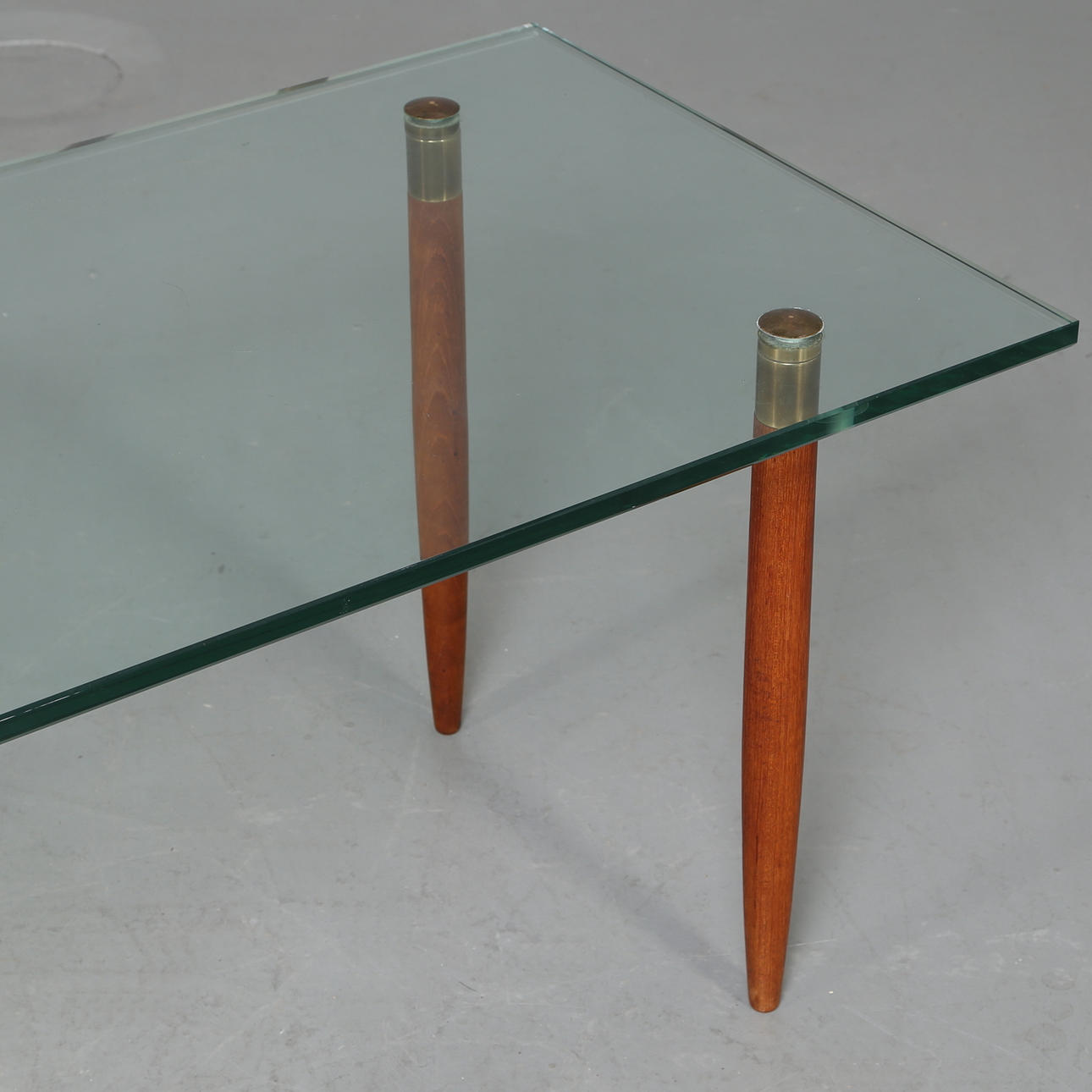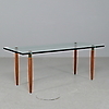 Soffbord med glasskiva och med ben i teak Bredd 60 cm Längd 140 cm Höjd 55 cm.