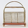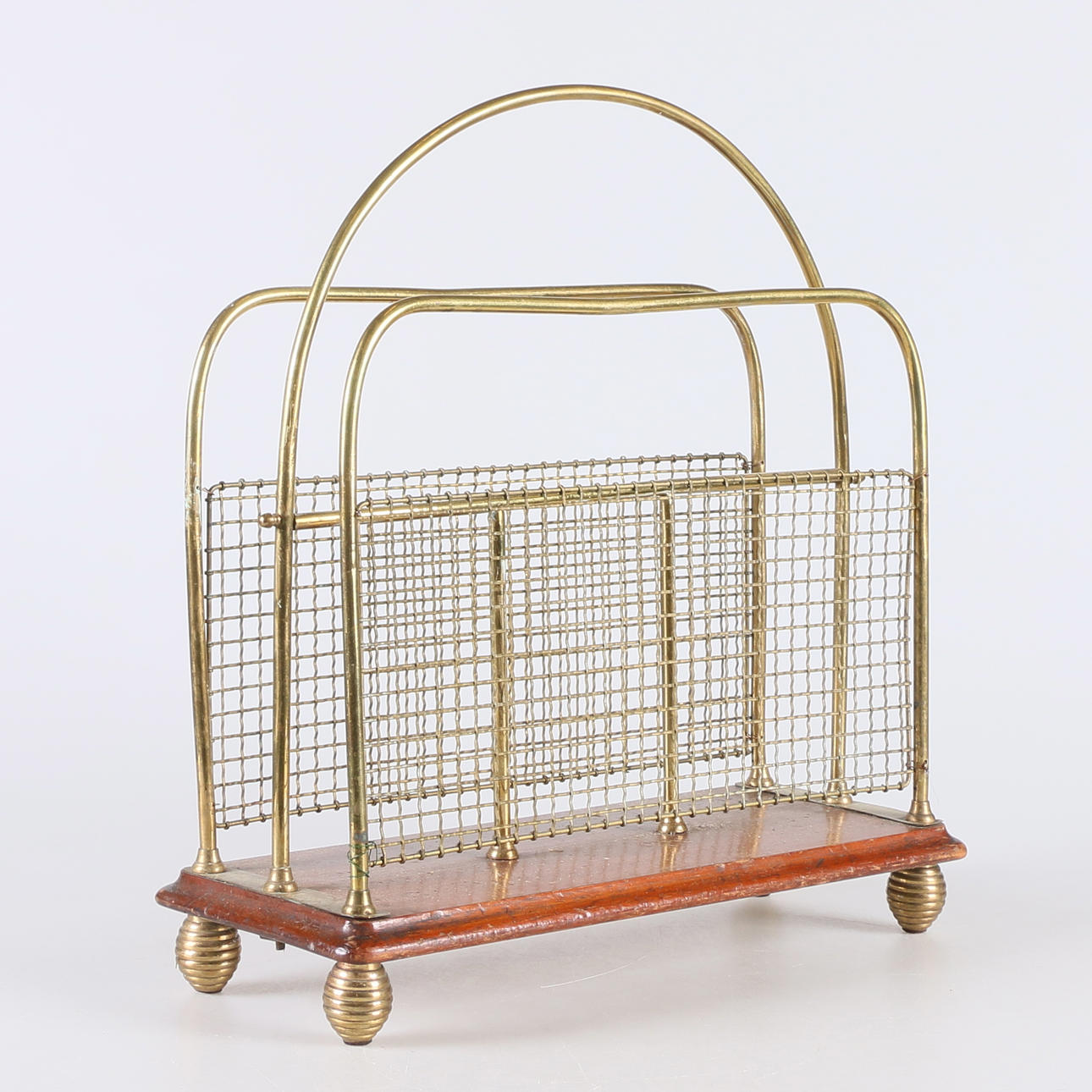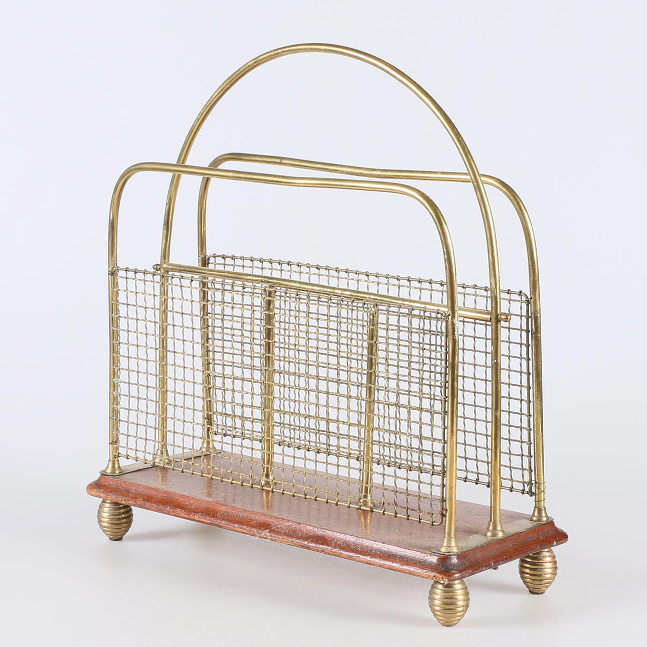 Tidningsställ, stomme i mässing med träbotten samt kulfötter Längd 40, bredd 16, höjd 43 cm.