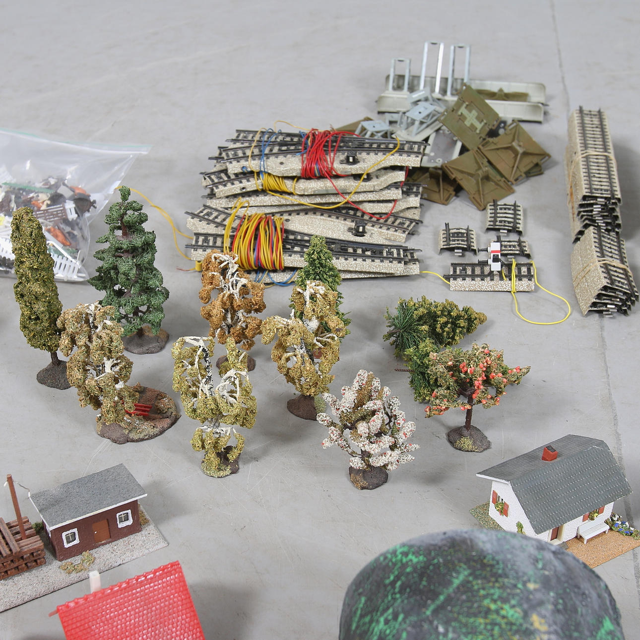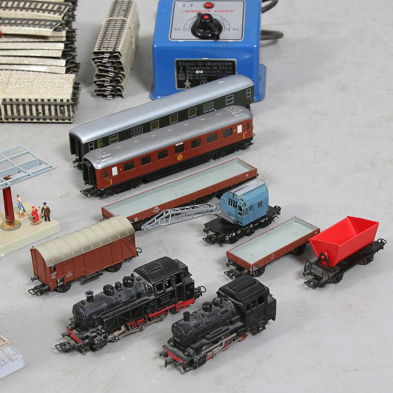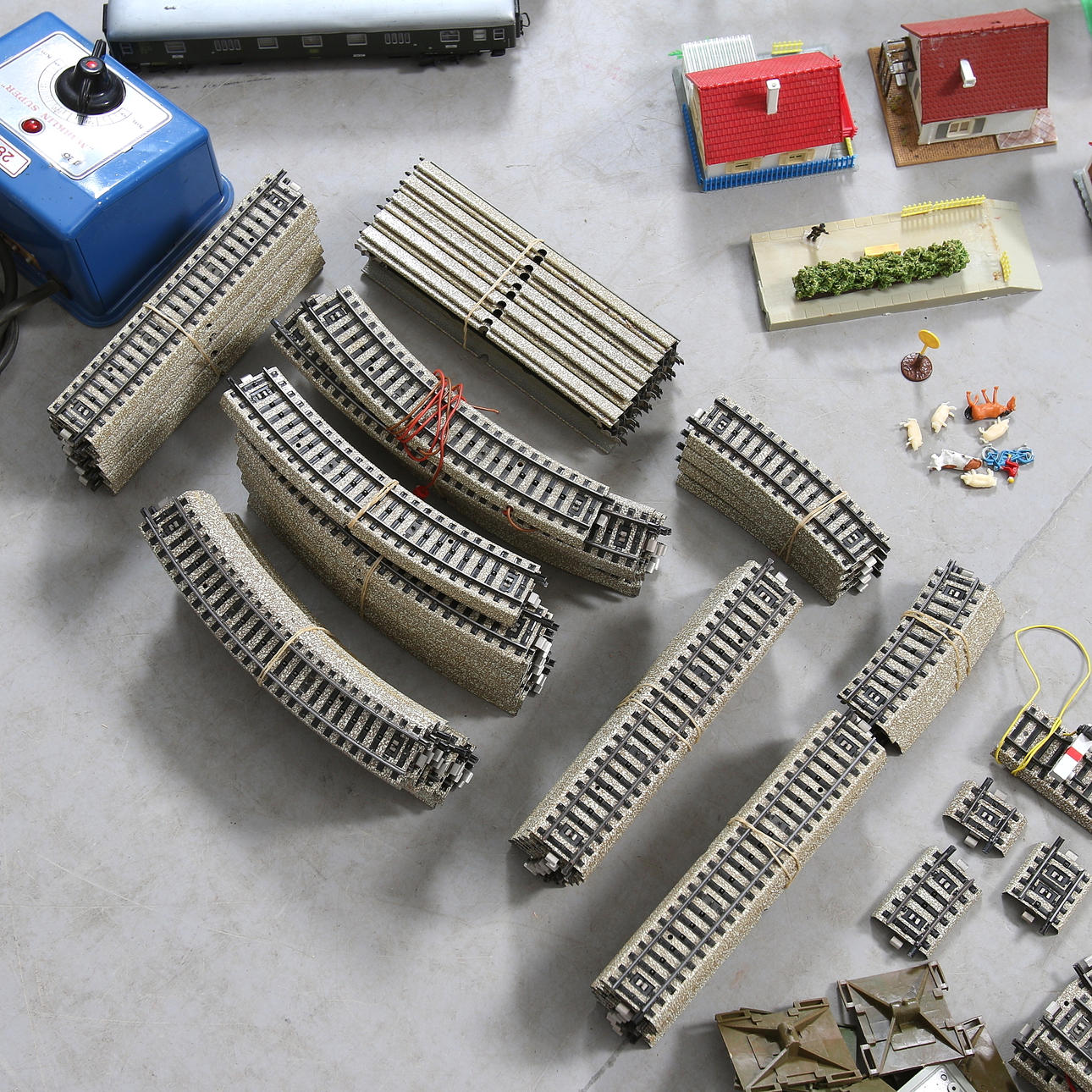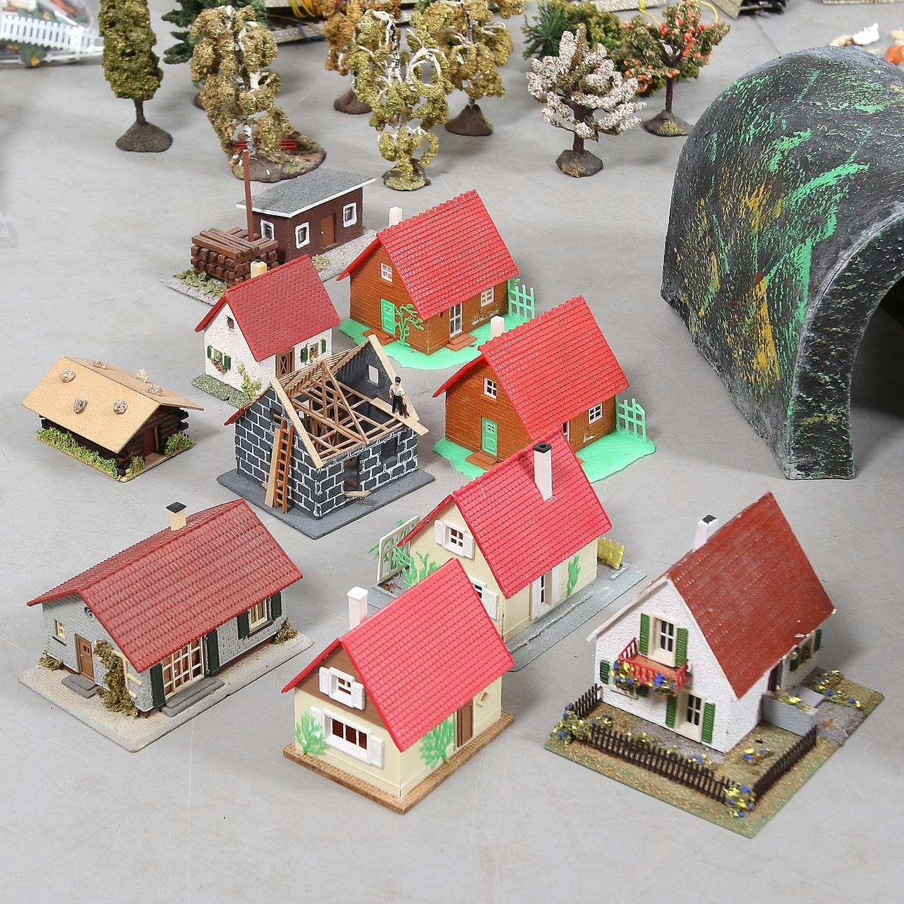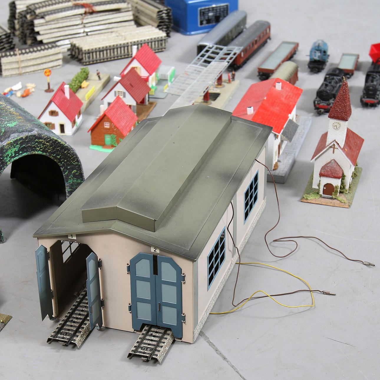 Perrong, station, kyrka och 14 hus, träd, bilar, djur mm.