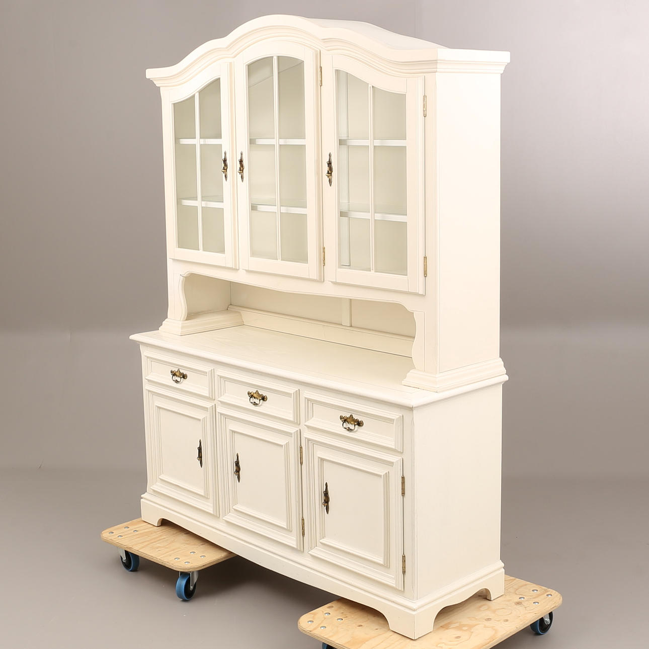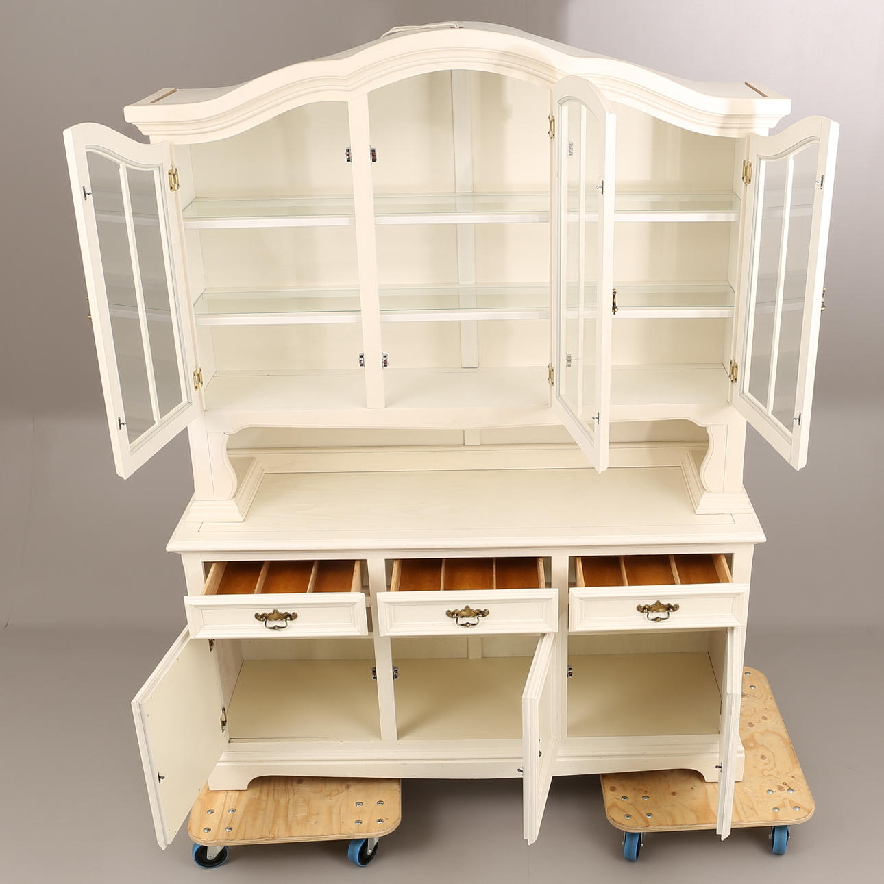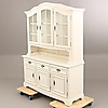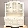 Ca Höjd ca 200 cm, 48 x 156 cm. Vitrinöverdel med glashyllor.