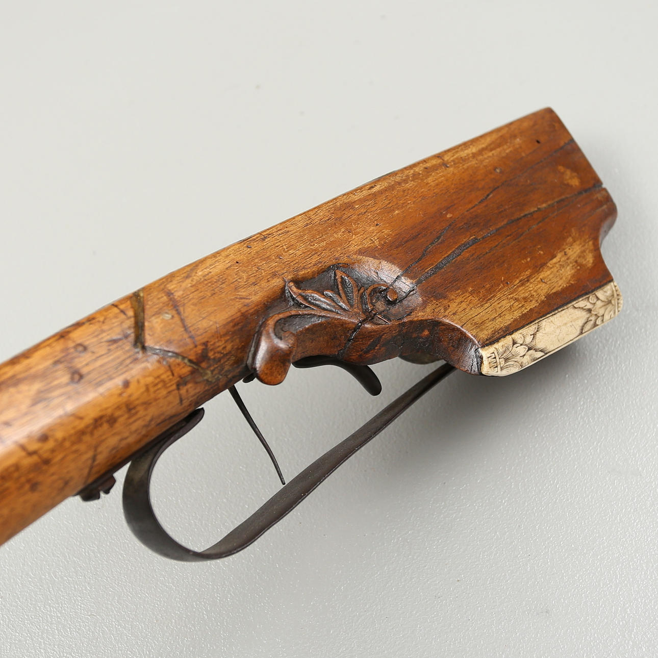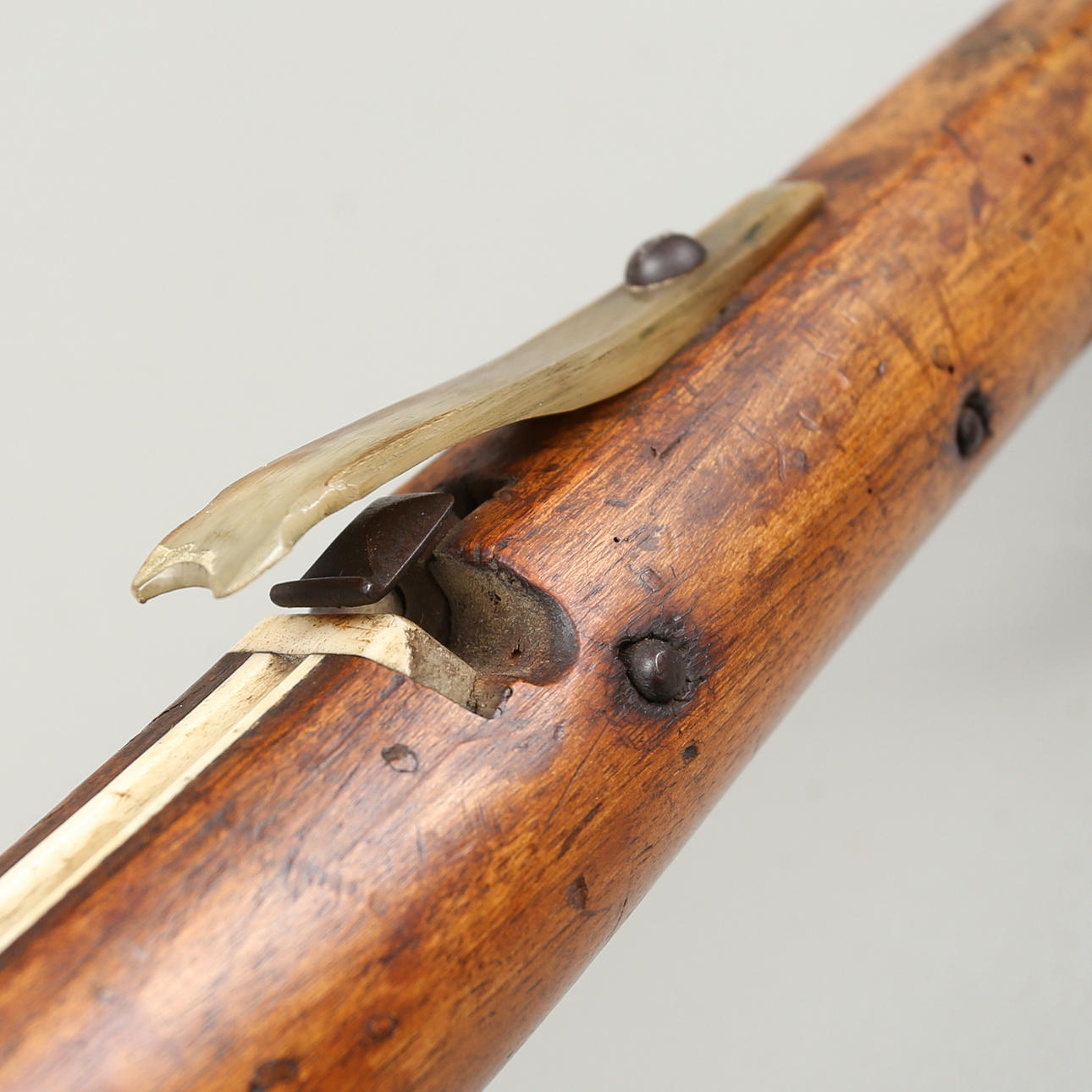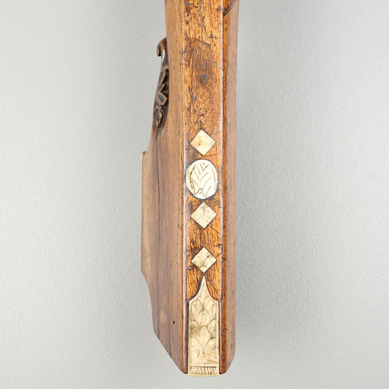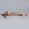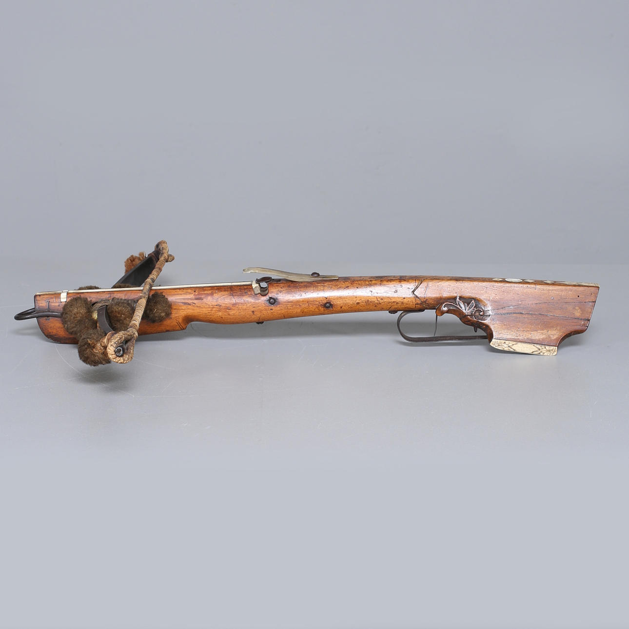 Armborst med båge i stål, kolv med inläggningar av horn med skuren dekor, avfyrningsanordning med snälltryck. Längd 61,5 cm, bågens bredd 52 cm.