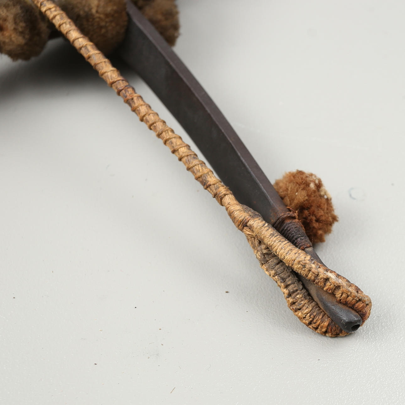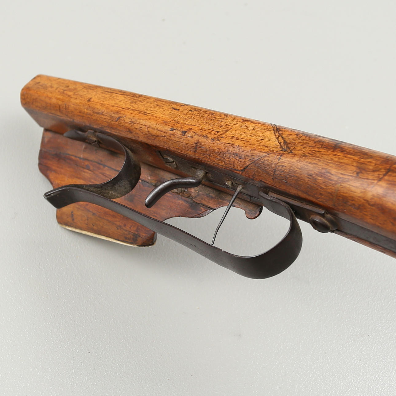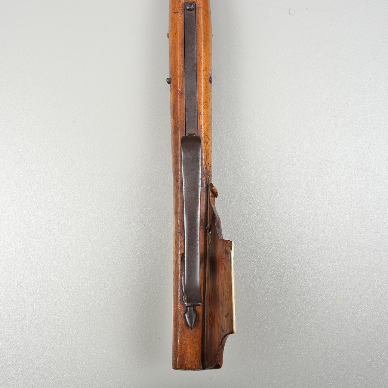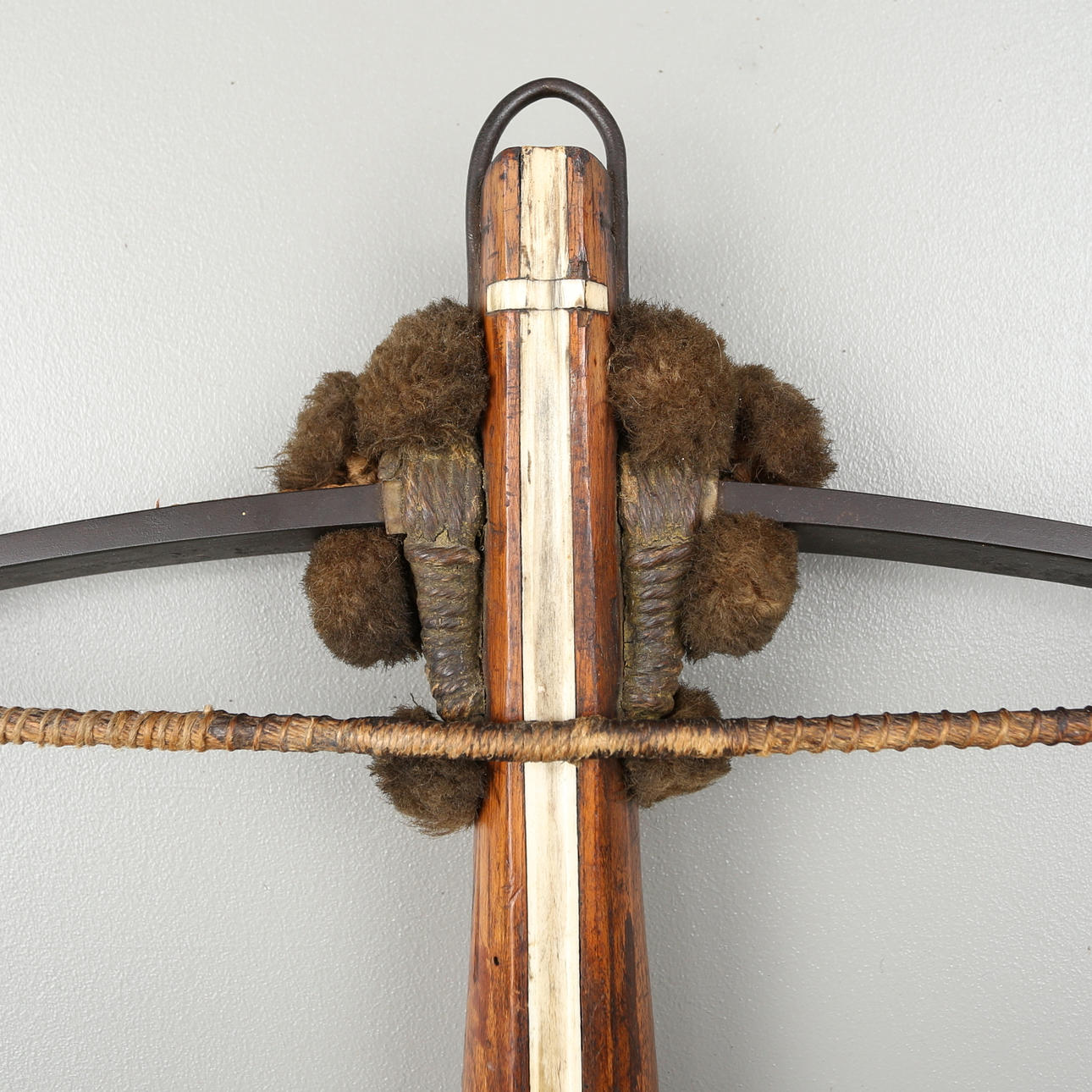 Armborst med båge i stål, kolv med inläggningar av horn med skuren dekor, avfyrningsanordning med snälltryck. Längd 61,5 cm, bågens bredd 52 cm.