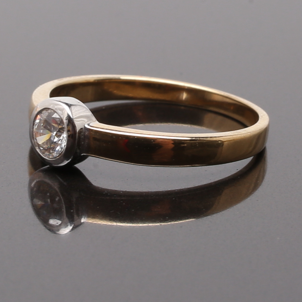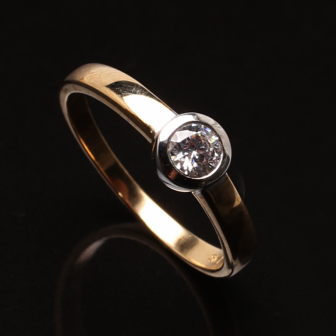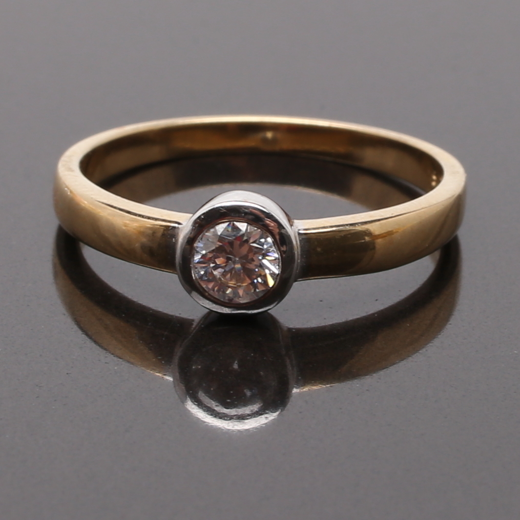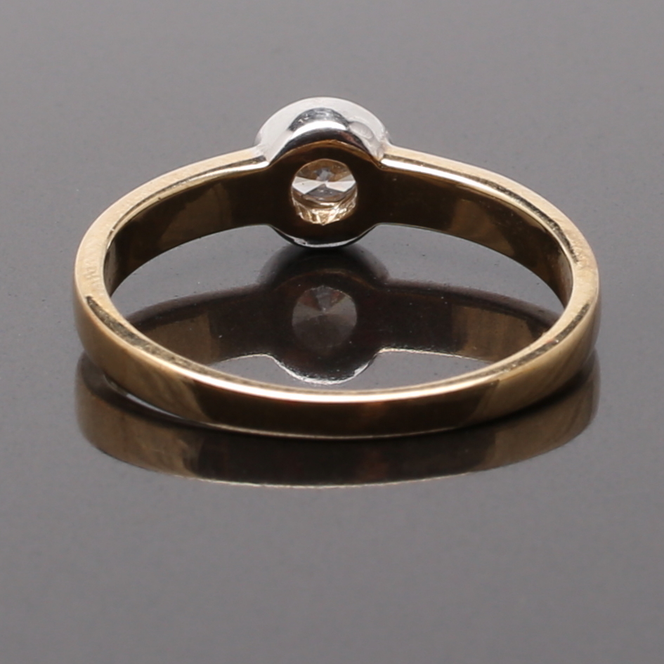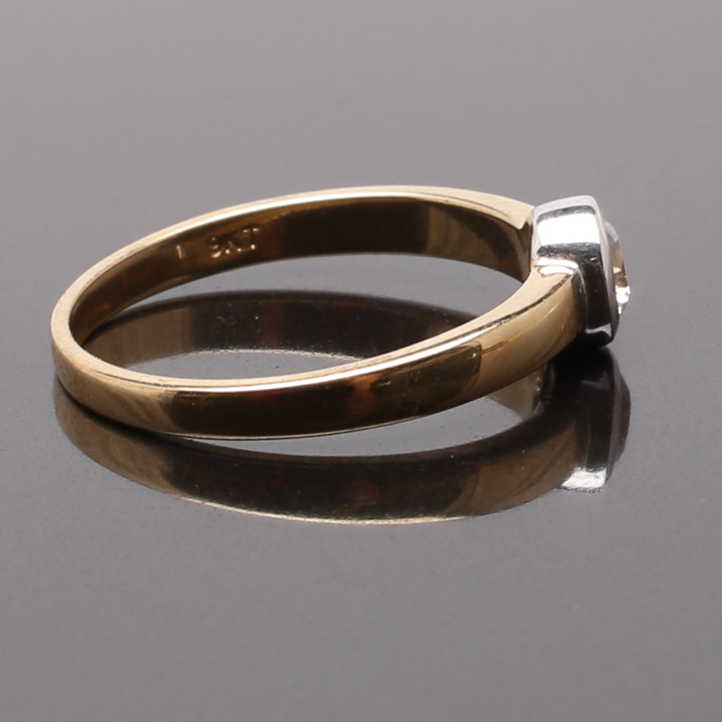 673576. RING 9 K guld med vit solitär sten.