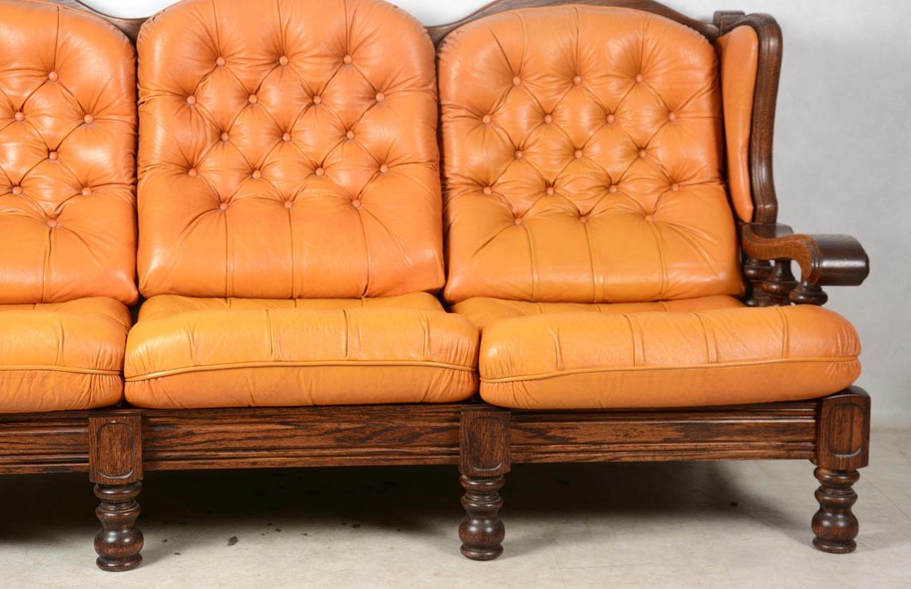 680361. SOFFA, 3-sits, skinn med betsad trästomme.