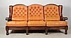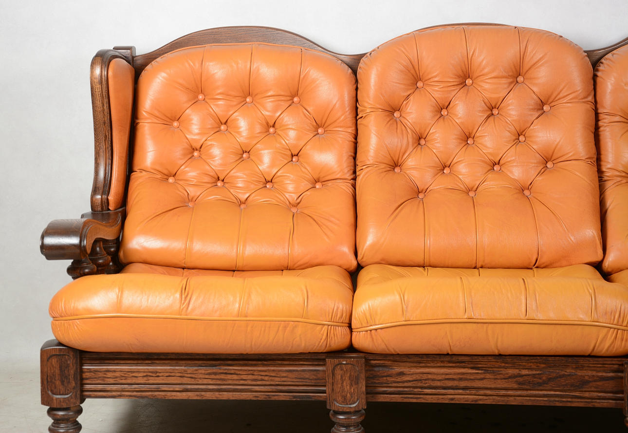 SOFFA, 3-sits, skinn med betsad trästomme.