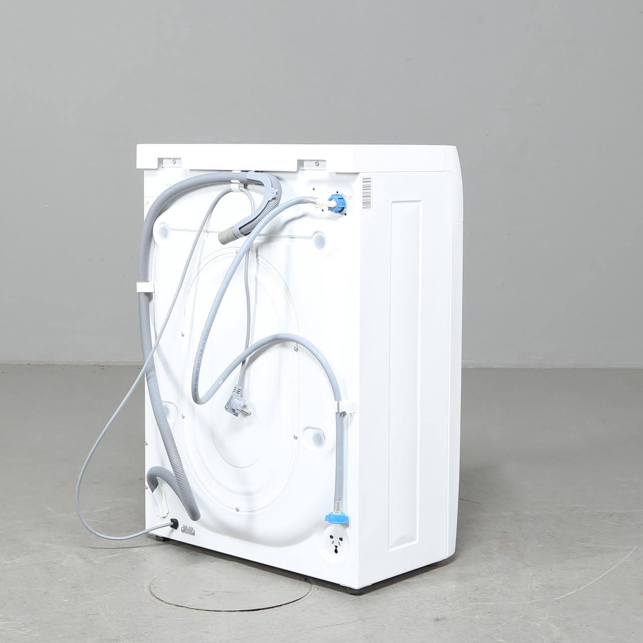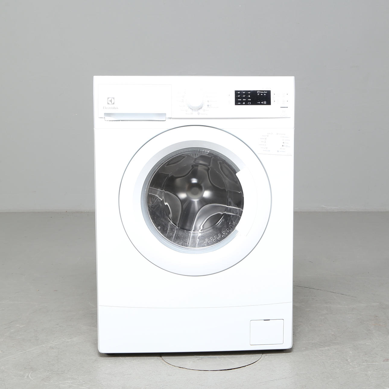 Kompakt Electrolux-tvättmaskin med 4 kg tvättkapacitet. Mått: bredd 59,5, höjd 84, djup 38 cm.