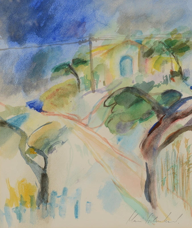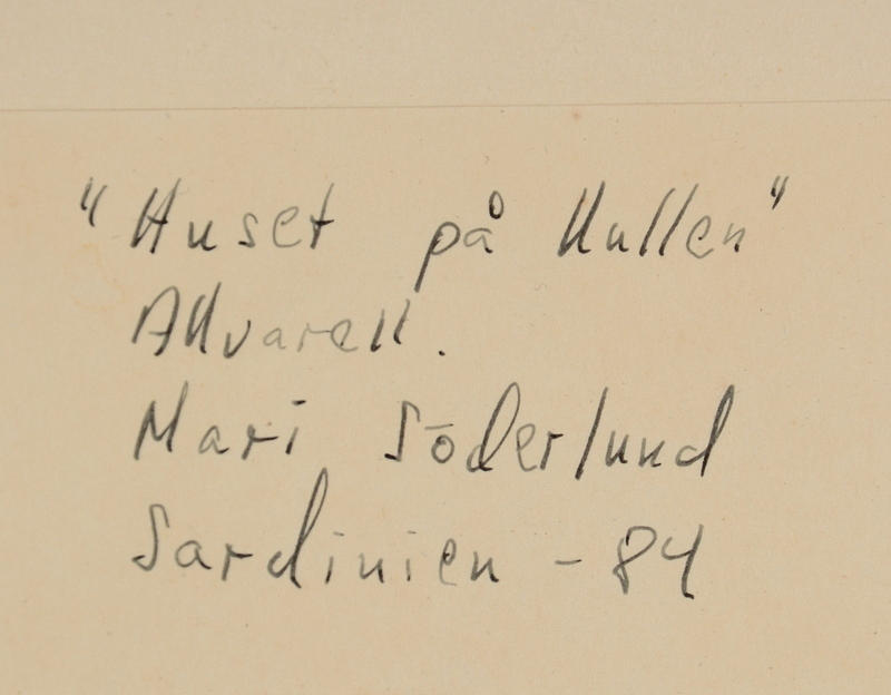 Huset på kullen. Signerad och a tergo betitlad och daterad Sardinien -84. 32x27 cm.