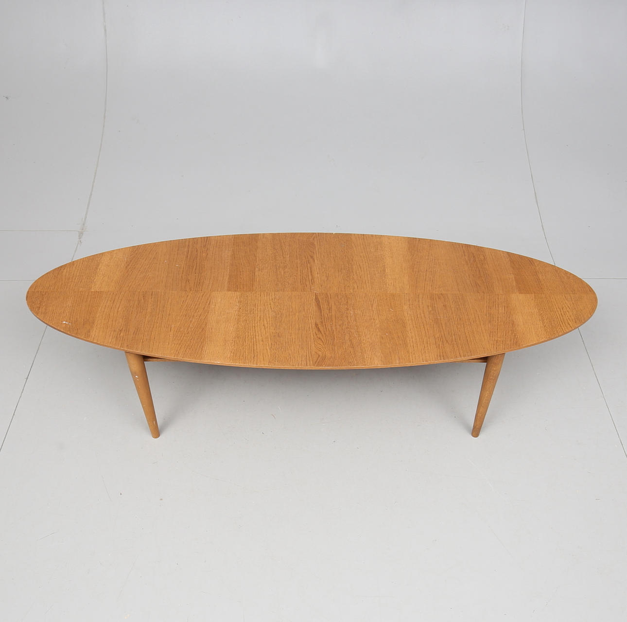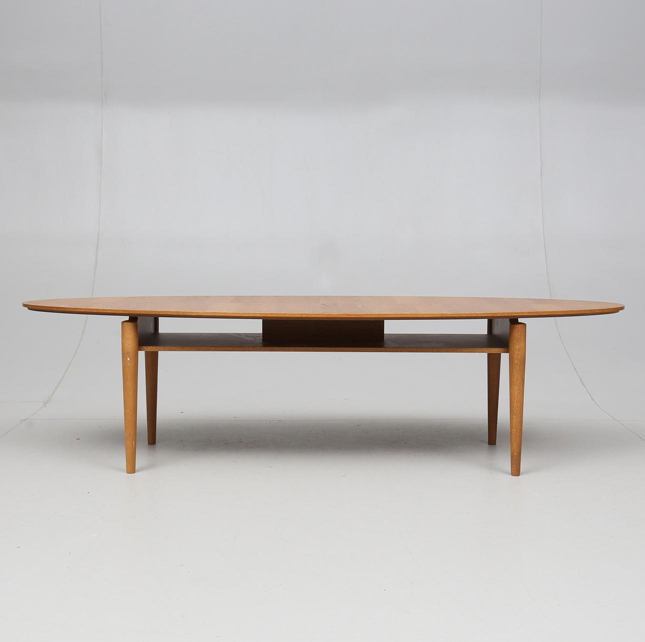 Fanerad med ek. Ett underliggande hyllplan. Längd 170. Bredd 60. Höjd 45 cm.