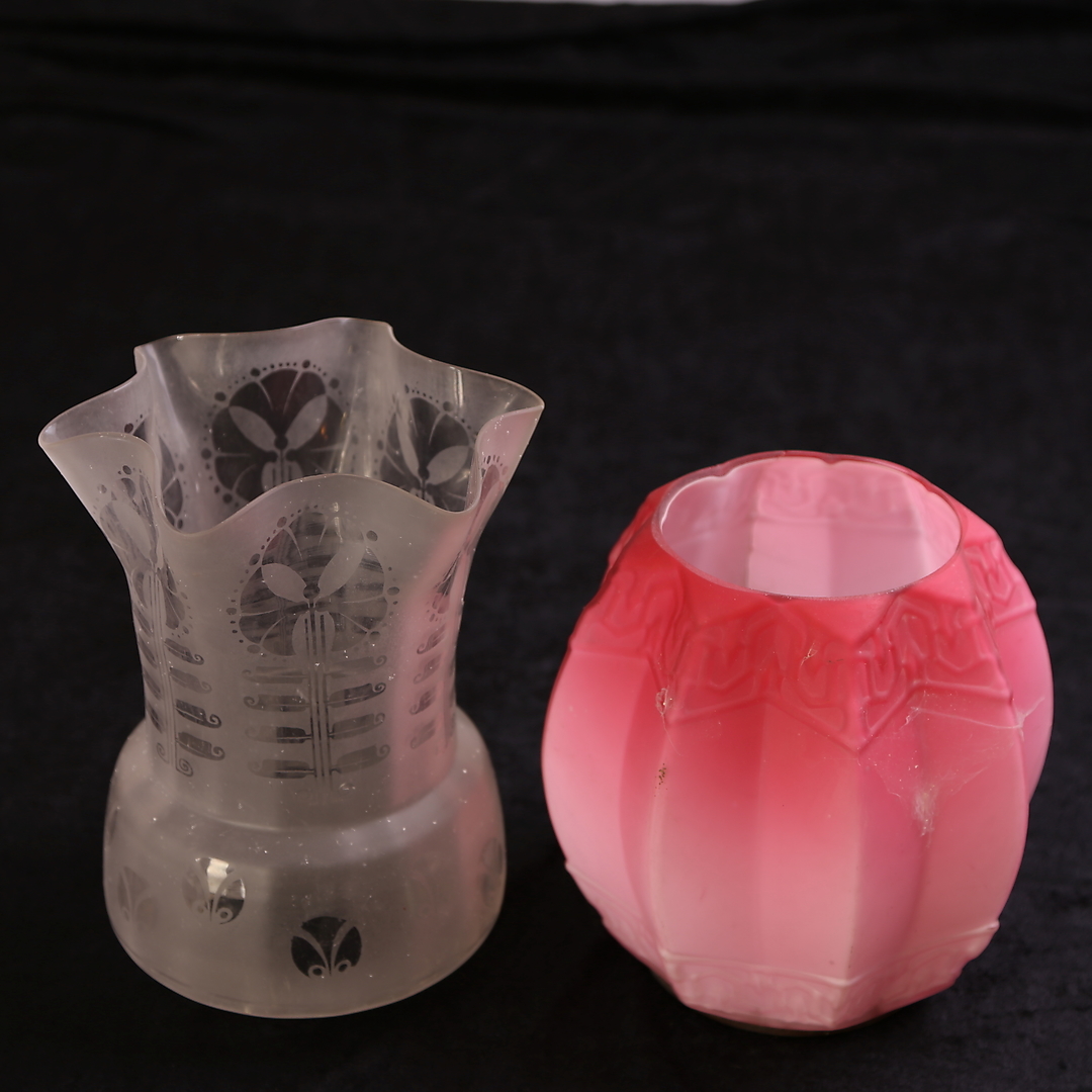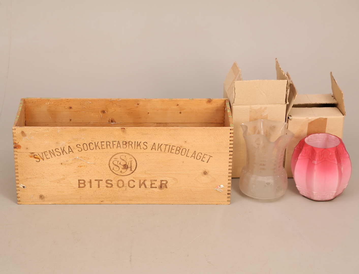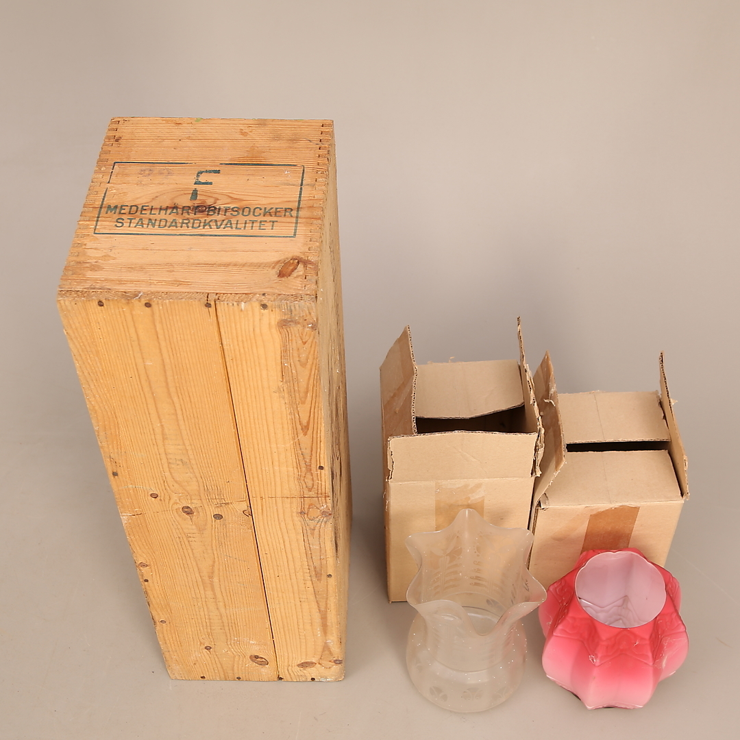 690511. LAMPKUPOR, 2 st, glas + SOCKERLÅDA, trä.