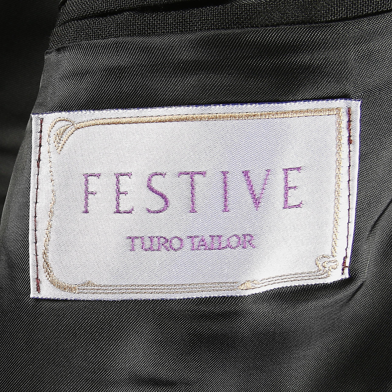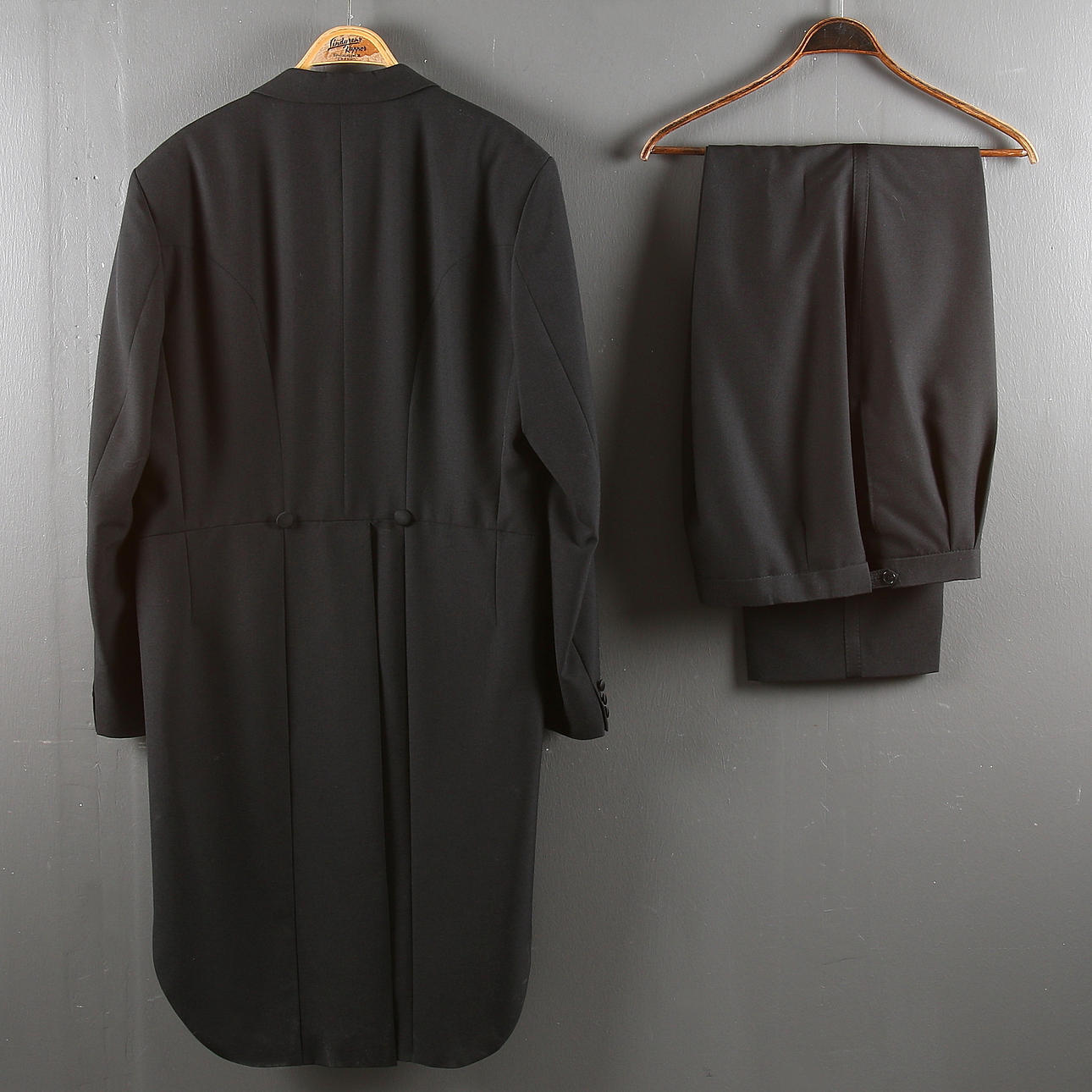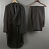 Svart frack, krage med spetsigt slag. Helfodrad med innerfickor. Byxor med passpoalfickor och blanka revärer.