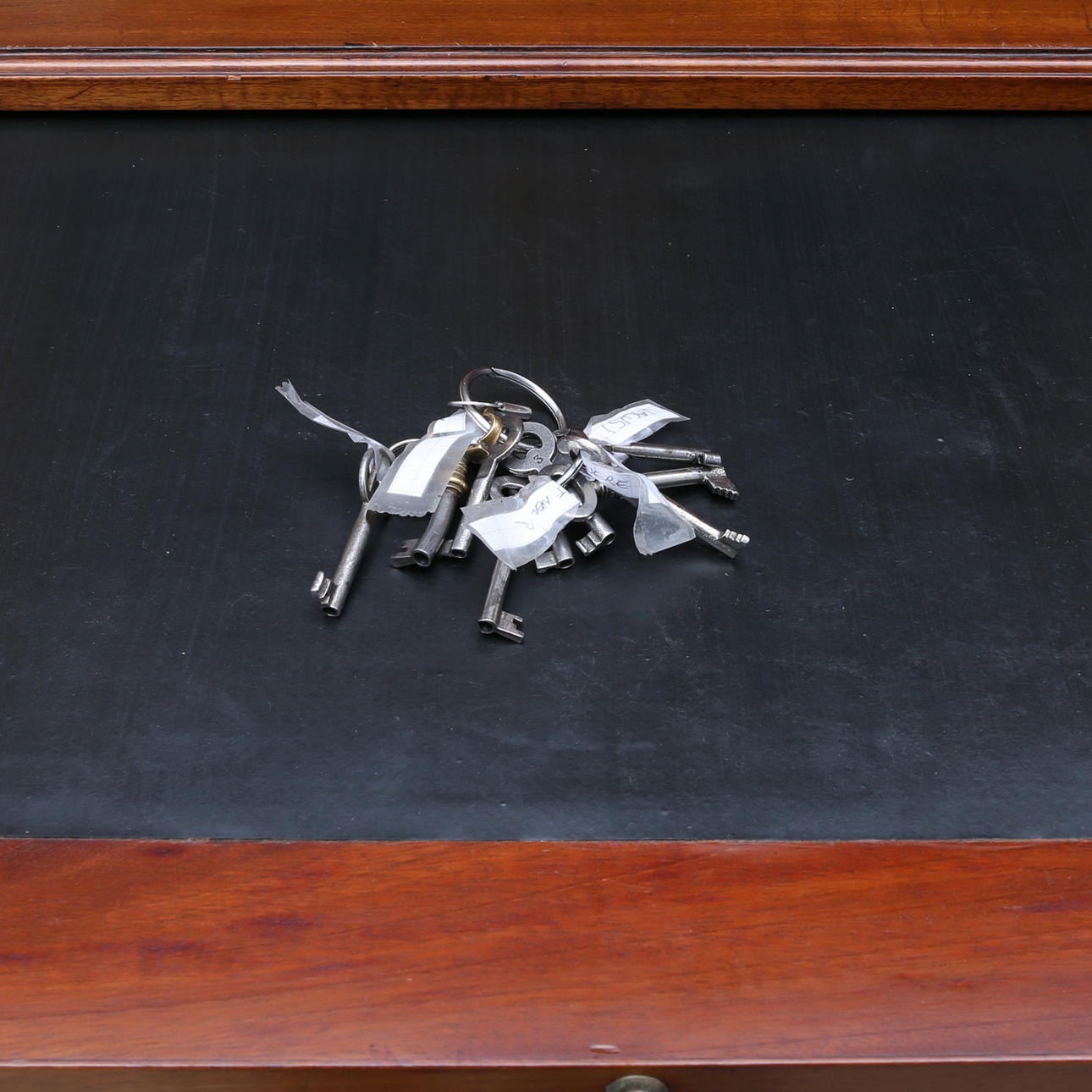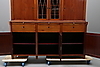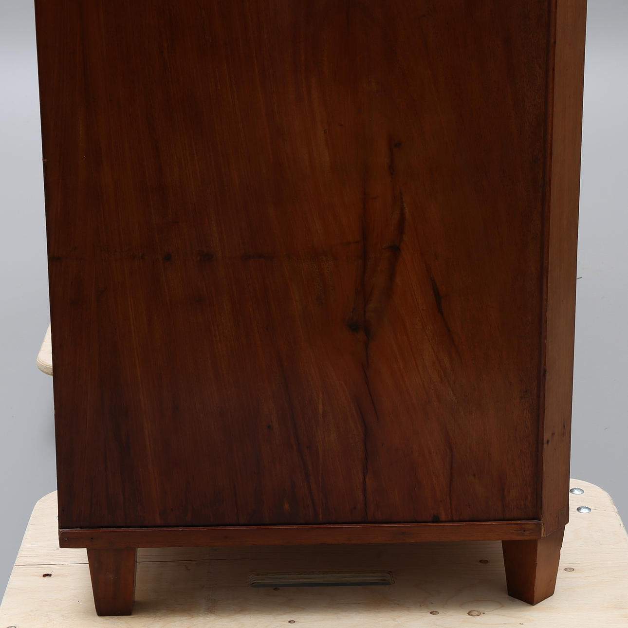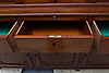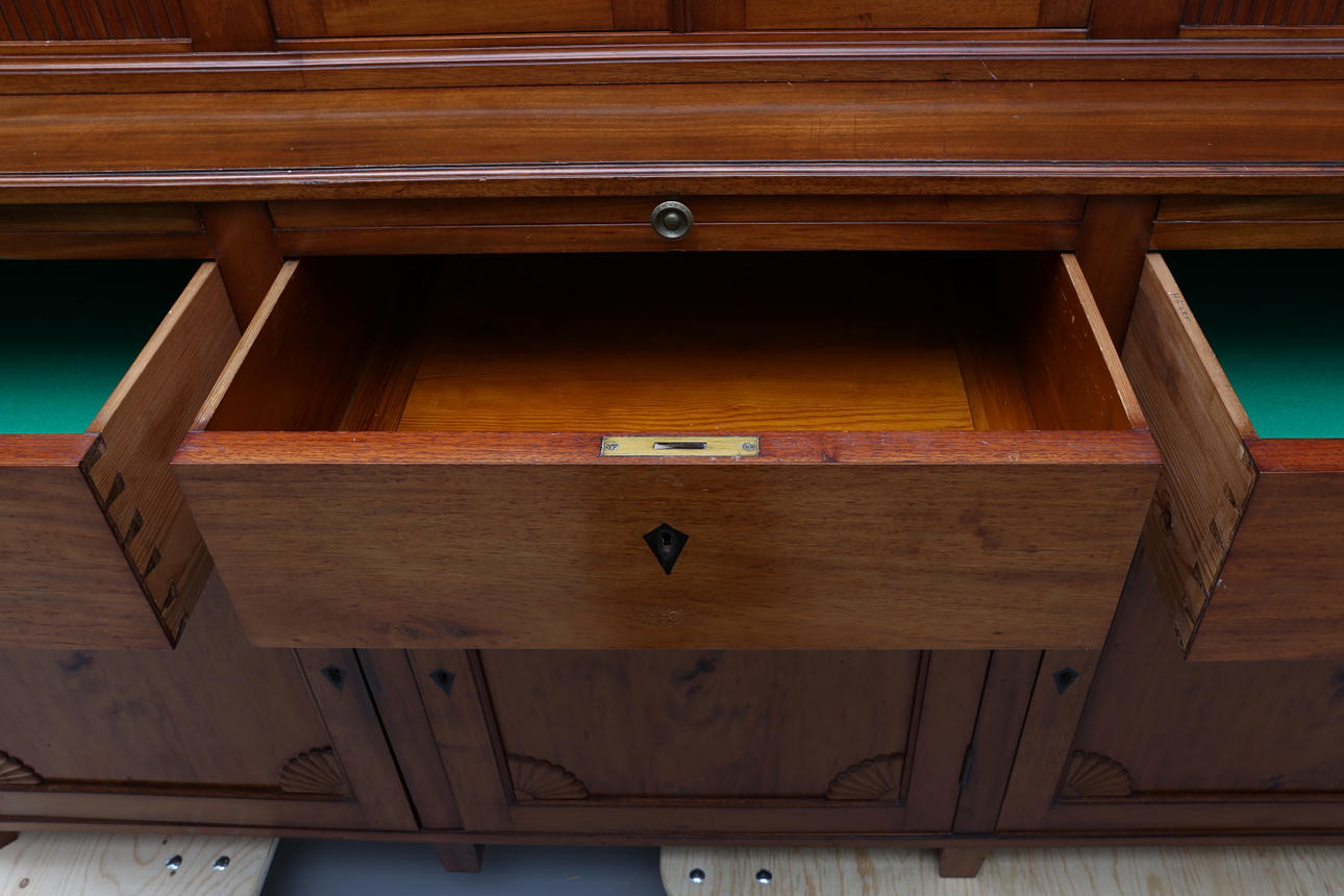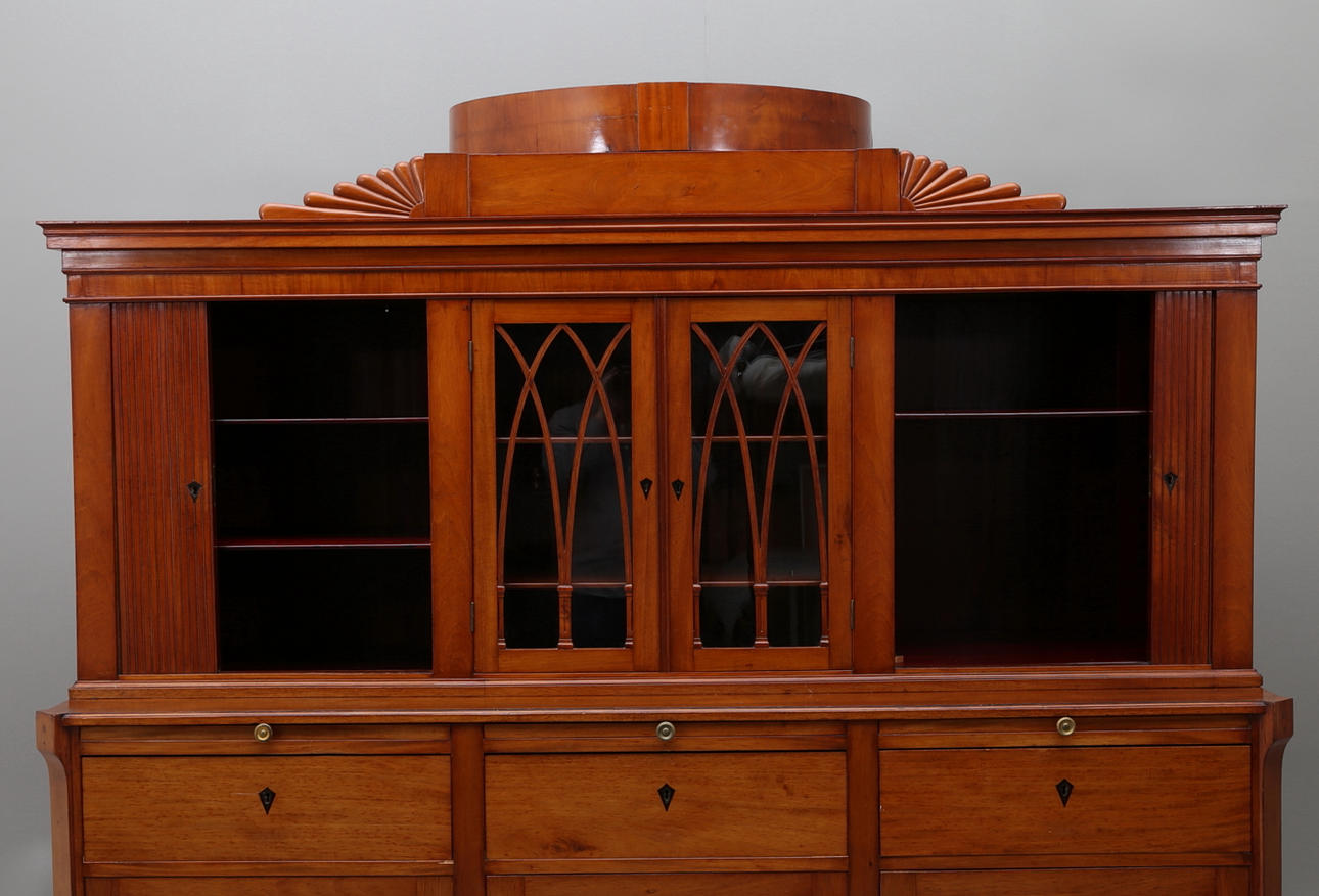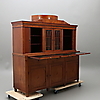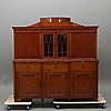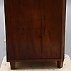 mahogny och mahognyfanér, två lönnlådor under kröndelen, nycklar medföljer, höjd 190, bredd 192 och djup 62 cm.