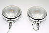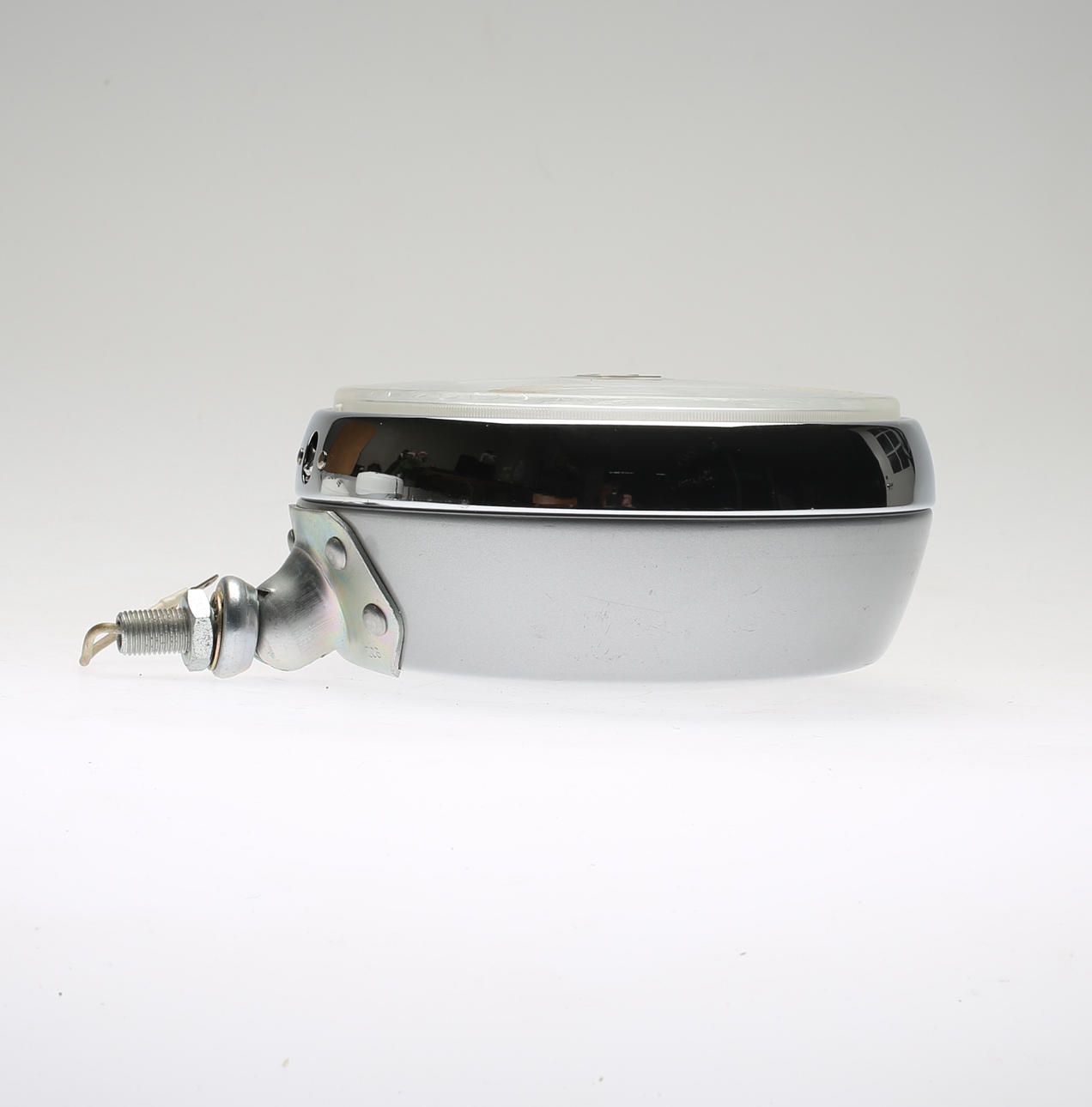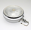 Metall, krom och glas. Skydd i plast. Diameter ca 20 cm.