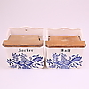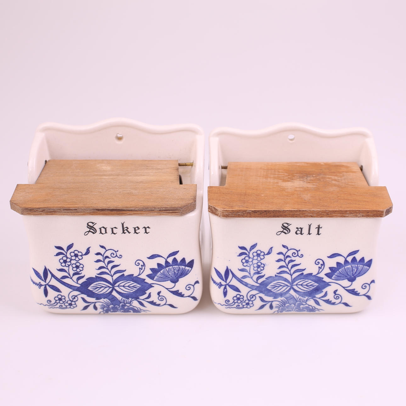 Kryddburkar med trälock, 2 st, porslin, Japan, höjd 11 cm, "Salt + Socker".