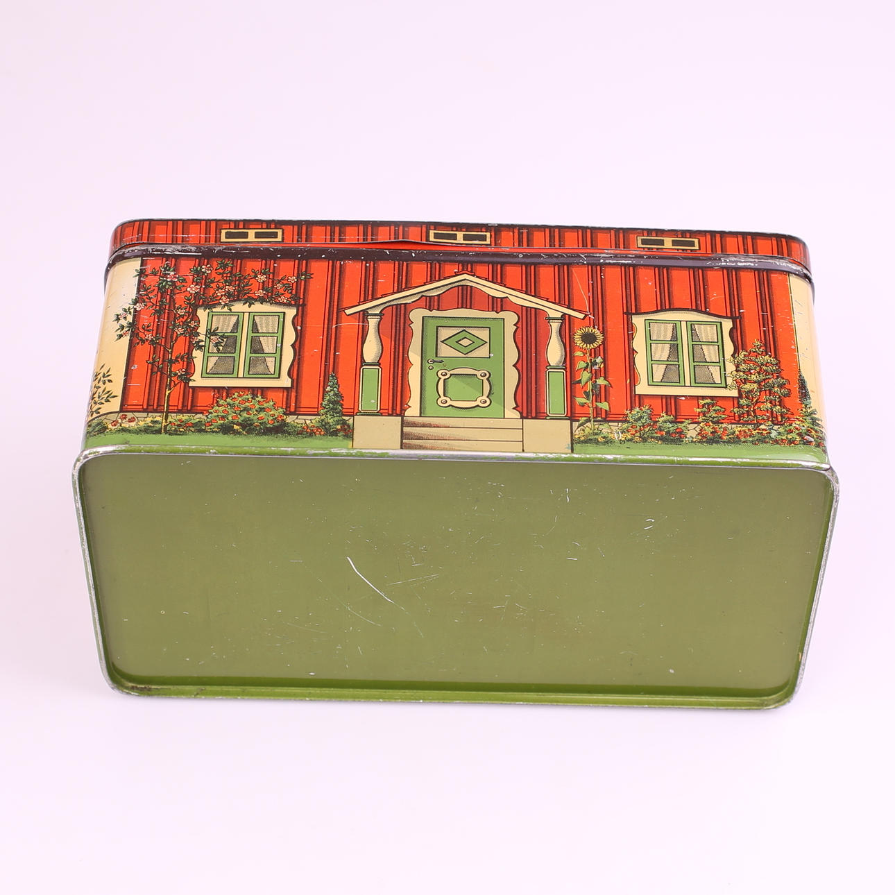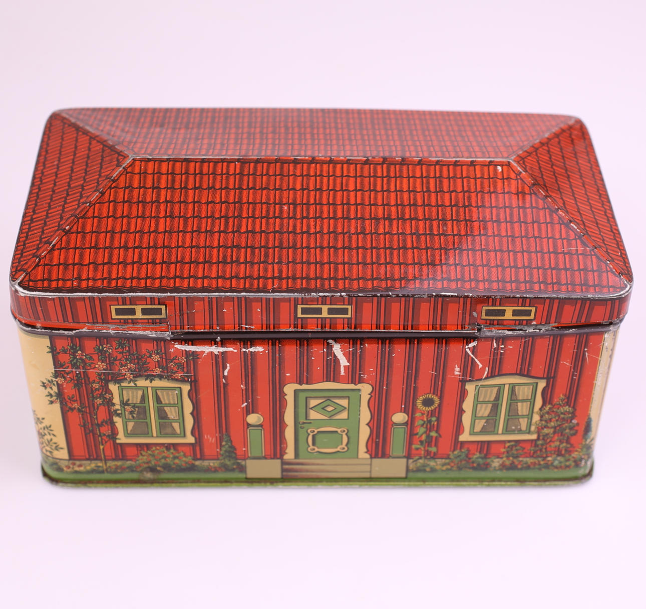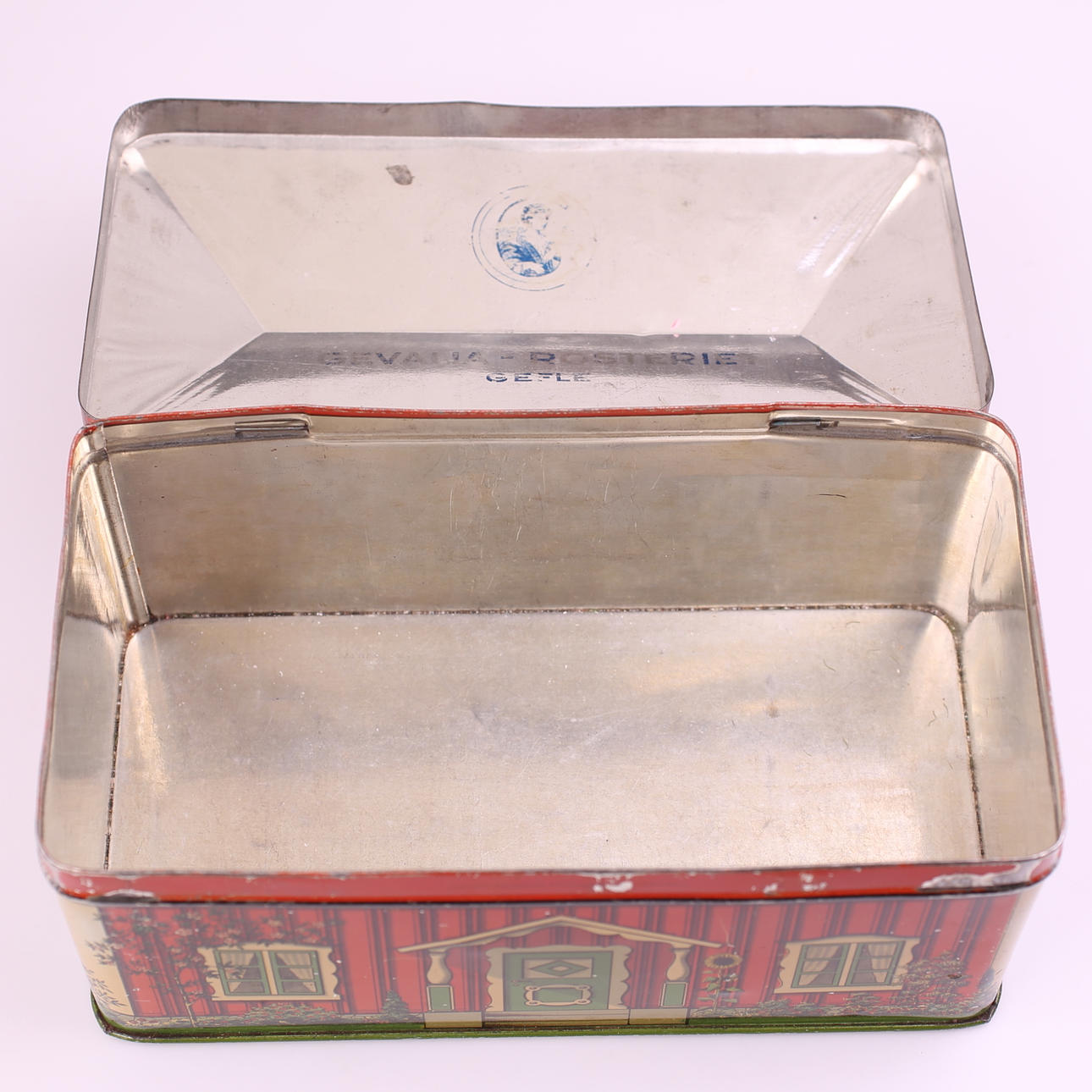 Plåtburk, rött hus, "Gevalia Rosterie - Gefle", höjd 13 cm, 24x12 cm.