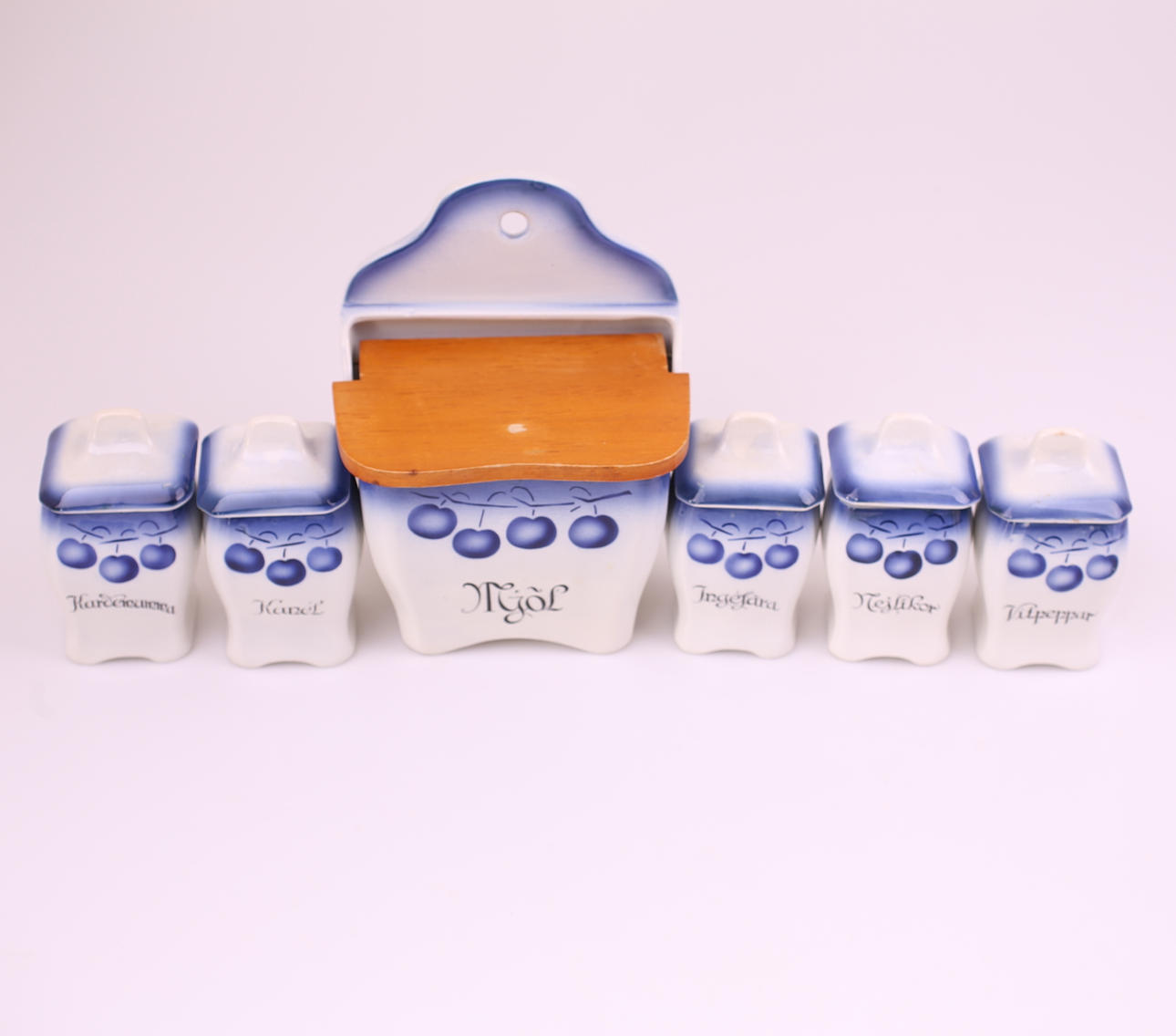 Kryddburkar, 6 st, porslin, plommondekor, Mjölburk med trälock höjd 19 cm, övriga burkar med lock höjd 11 cm.