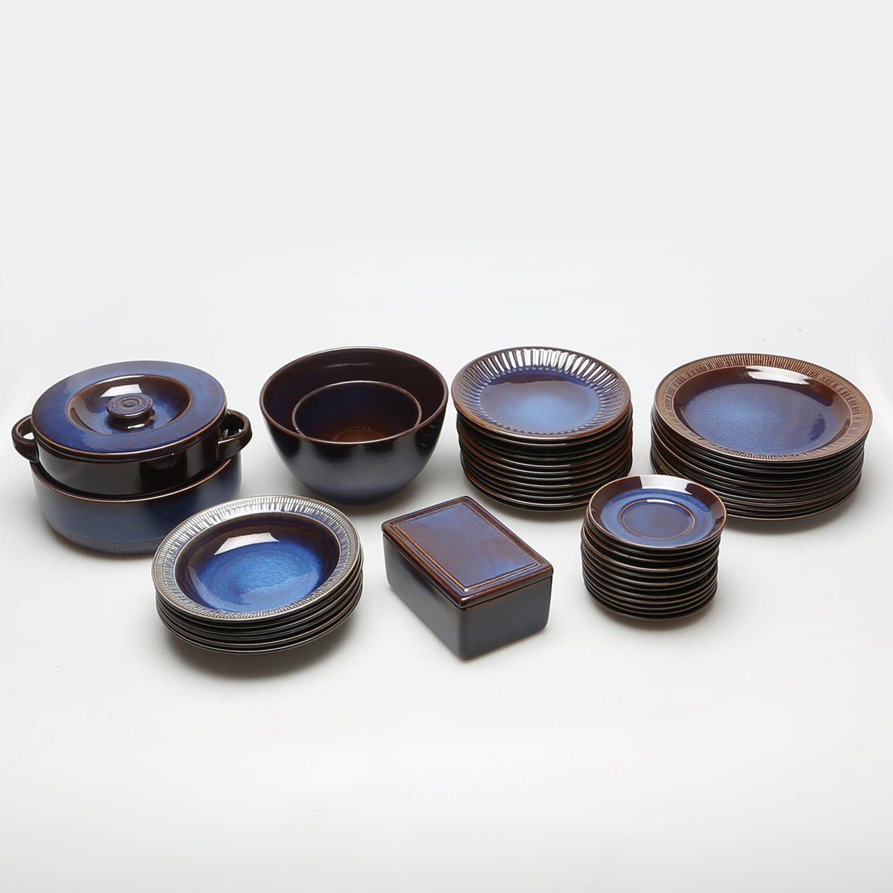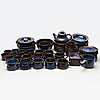 12 mattallrikar, 6 djupa tallrikar, form, 2 skålar, smörask, terrin, tekanna, gräddkanna, sockerskål, 12 tekoppar, 12 tefat, 12 assietter, 8 kaffekoppar, 12 kaffefat.