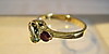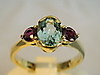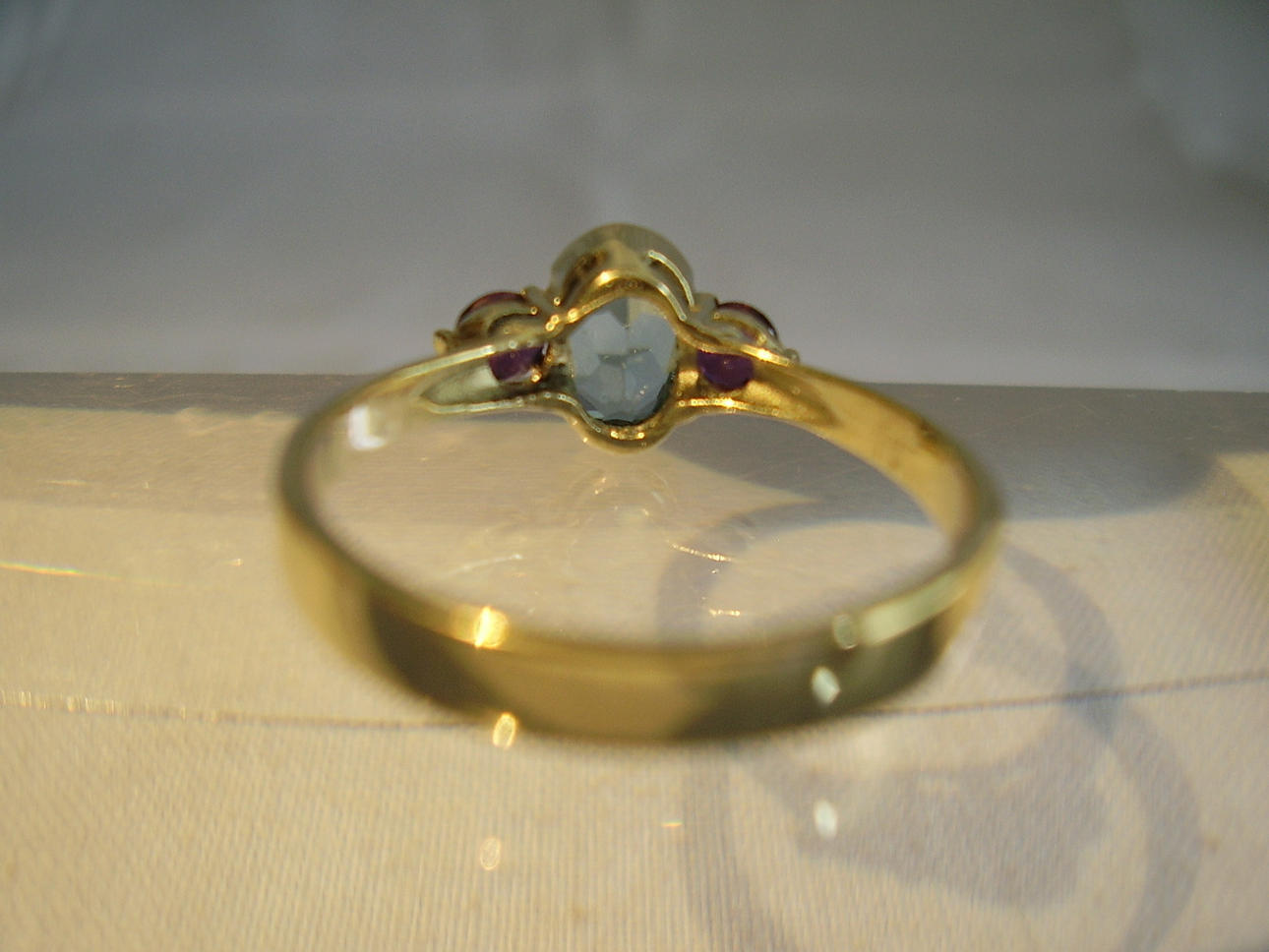 Ringen är tillverkad i 585 gult guld = 14 karat och är stämplad som sådan. Ringhuvudet är satt med en oval fasetterad blå topas (0,80 ct.) och flankerad av runda fasetterade rubiner på båda sidor (totalt 0,40 ct.) i en vacker färg.