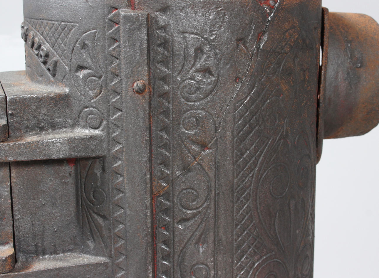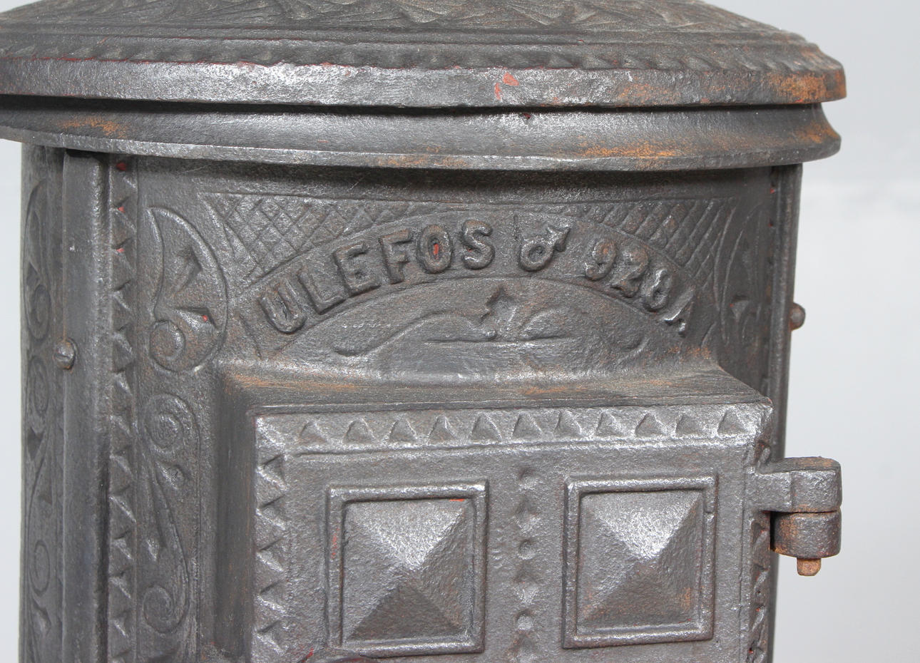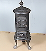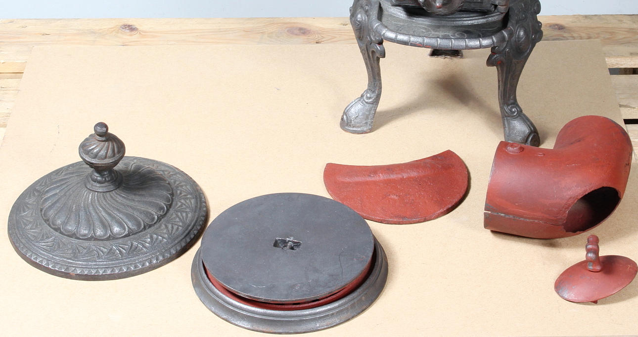 Renoverad kamin i gjutgods, total höjd 75, diameter ca. 30 cm. Samtliga tillbehör ingår.