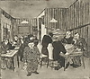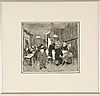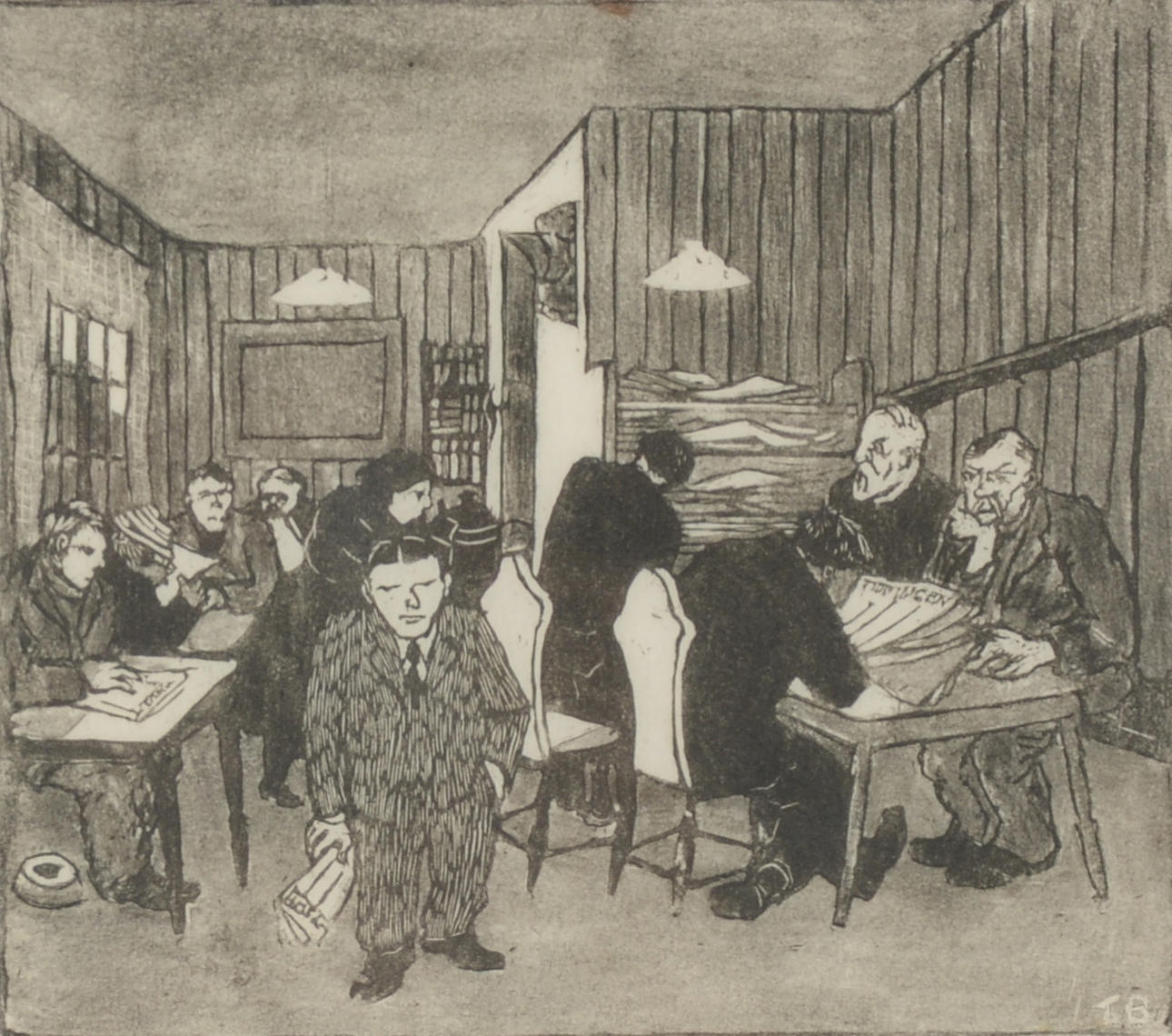 Tidningsläsande personer. Signerad. 19x21 cm.
