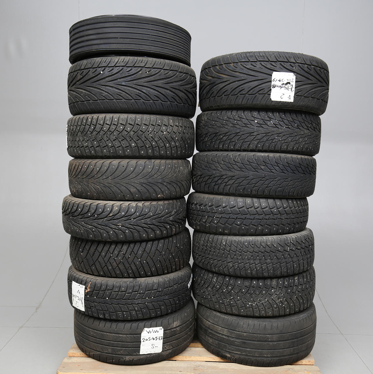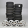 12 däck, fyra fälgar, två däck med fälg och ett reservhjul. Däck i olika modeller och storlek. Sommar och vinterdäck.